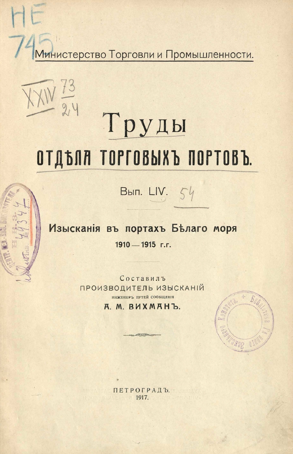 Вихман А.М. Изыскания в портах Белого моря. 1910–1915 гг. / Труды Отдела торговых портов. Пг., 1917. Вып. 54.
