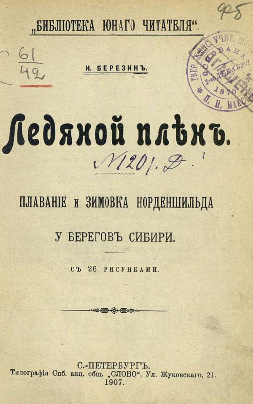 Березин Н.И. Ледяной плен. Плавание и зимовка Норденшильда у берегов Сибири. СПб.: Типография Спб. акц. общ. "Слово", 1907. — 112 с.