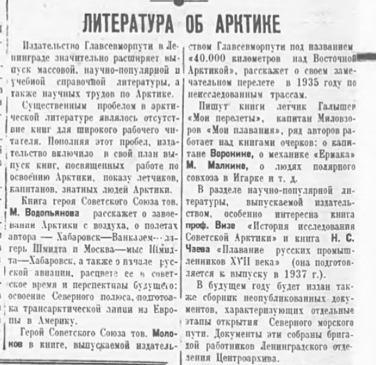 Казалось бы, и условия для успешного решения поставленной задачи налицо: aвтором значится В. Ю. Визе — председатель Ученого совета Арктического института, в составе которого числится отдел истории; издатель — располагающее достаточными материально-техническими возможностями издательство Главсевморпути, призванное публиковать доброкачественные труды по вопросам Советского Севера. Однако первые же страницы рассматриваемой книжки раскрывают нам иное положение дел.