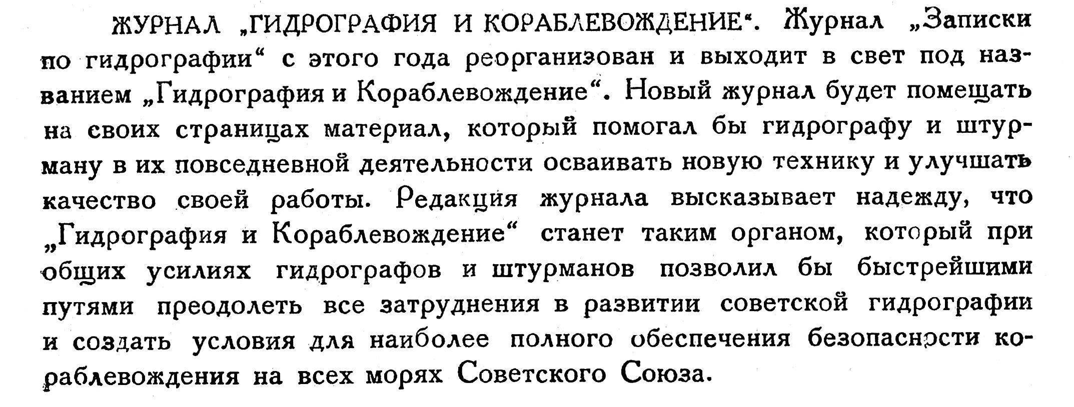 ЖУРНАЛ „ГИДРОГРАФИЯ И КОРАБЛЕВОЖДЕНИЕ". Журнал "Записки по гидрографии" с этого года реорганизован и выходит в свет под названием „Гидрография и Кораблевождение". Новый журнал будет помещать на своих страницах материал, который помогал бы гидрографу и штурману в их повседневной деятельности осваивать новую технику и улучшать качество своей работы. Редакция журнала высказывает надежду, что „Гидрография и Кораблевождение" станет таким органом, который при общих усилиях гидрографов и штурманов позволил бы быстрейшими путями преодолеть все затруднения в развитии советской гидрографии и создать условия для наиболее полного обеспечения безопасности кораблевождения на всех морях Советского Союза.