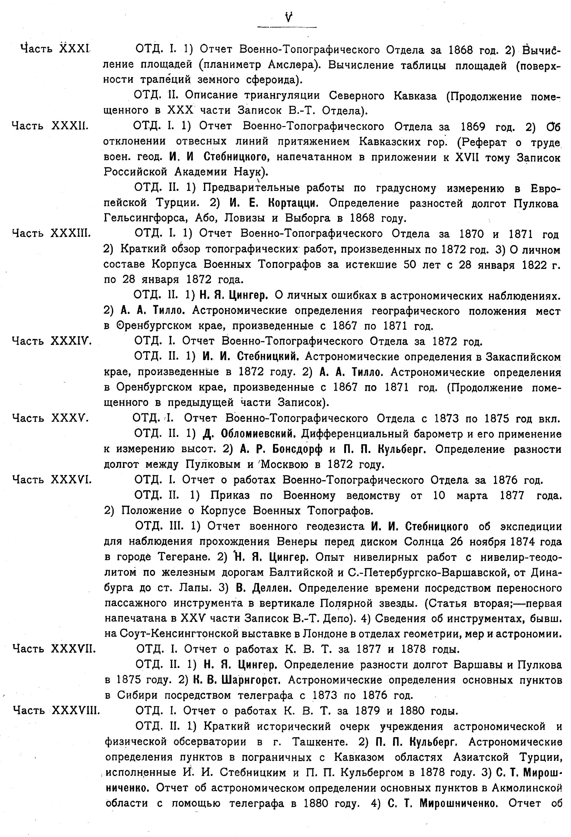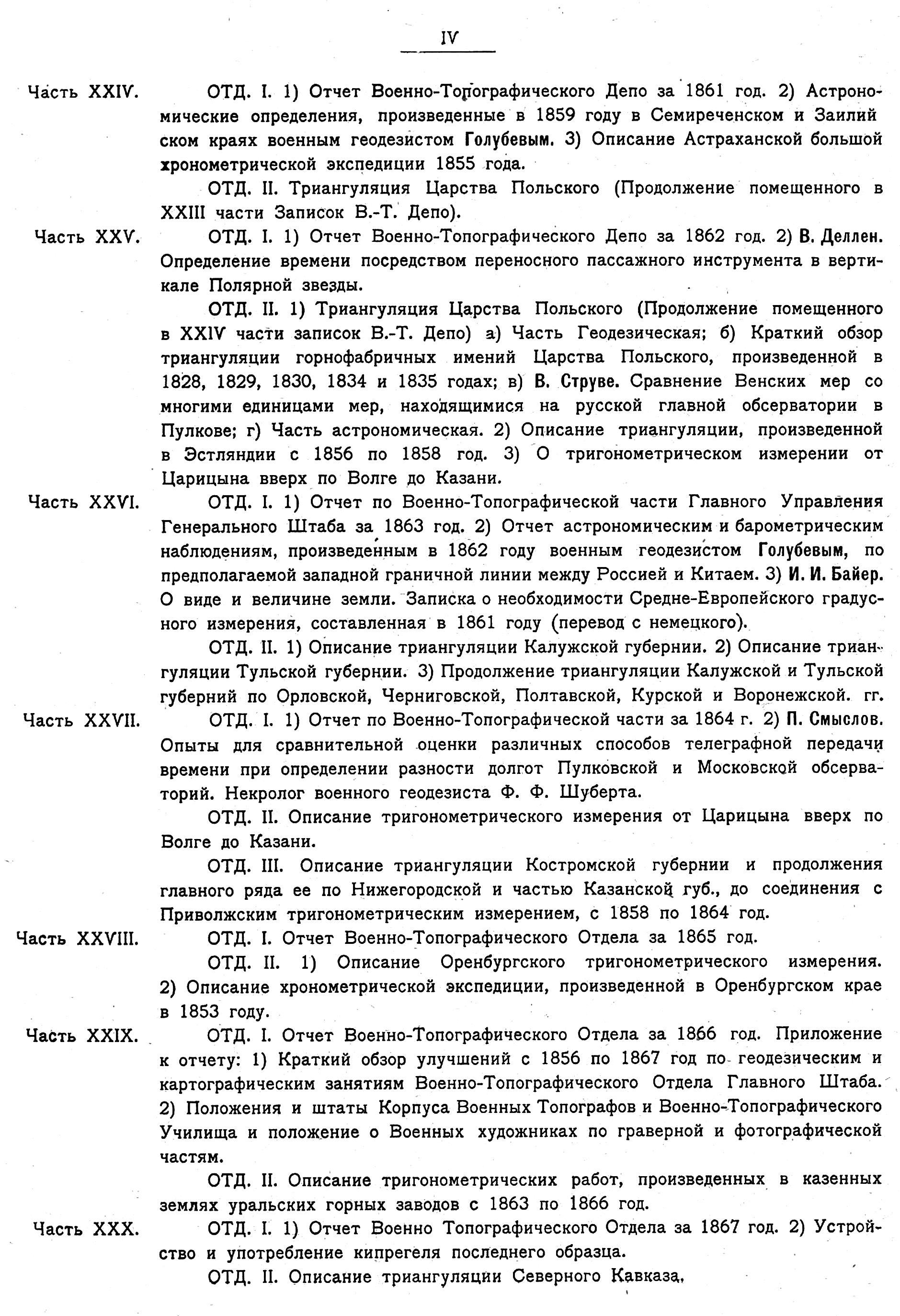 ОТД. II. 1) Триангуляция Царства Польского (Продолжение помещенного в XXIV части записок В. -Т. Депо) а) Часть Геодезическая; б) Краткий обзор триангуляции горнофабричных имений Царства Польского, произведенной в 1828, 1829, 1830, 1834 и 1835 годах; в) В. Струве. Сравнение Венских мер со многими единицами мер, находящимися на русской главной обсерватории в Пулкове; г) Часть астрономическая. 2) Описание триангуляции, произведенной в Эстляндии с 1856 по 1858 год. 3) О тригонометрическом измерении от Царицына вверх по Волге до Казани.
