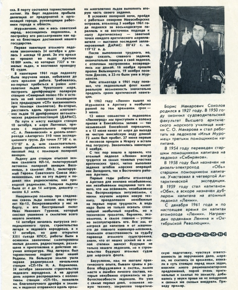 Нет слов, чтобы выразить нашу благодарность замечательным советским ученым. С полной уверенностью можно сказать: «Вот пример блестящего соединения науки с практикой!» Кто из первого экипажа атомохода не знает лично нашего видного ученого, директора Института атомной энергии, ныне Президента Академии Наук СССР Анатолия Петровича Александрова! Наш ледокол во многом — его детище.