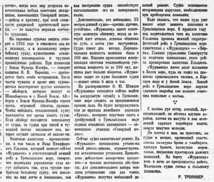 Уже в июне 1937 г. «Мурманец» вышел с экспедицией «Ледовый патруль» в западный сектор Арктики для обеспечения очередной арктической навигации.