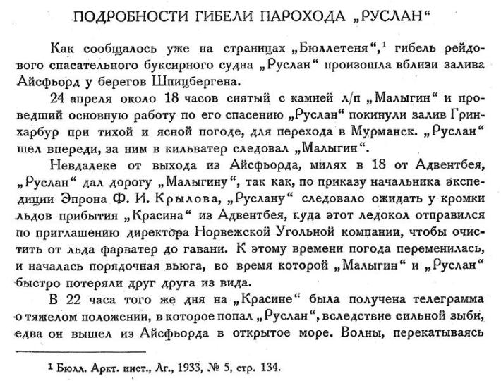 Из Мурманска сообщают, что спасательной судно «Руслан», возвращаясь со Шпицбергена. 24 апреля было застигнуто сильным штормом. Поиски судна у берегов Шпицбергена ледоколом «Красин» в течение трех суток не дали результатов. Есть основания предполагать. что судно погибло. Для поисков команды вдоль побережья Шпицбергена направлена экспедиция на собаках.