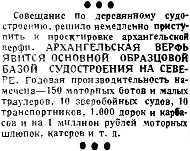 Завод предполагает достроить и сдать Архангельску 1 судно в июне 1930 года и 2 в июле. Относительно этих сроков товарищ Грибанов заявил: