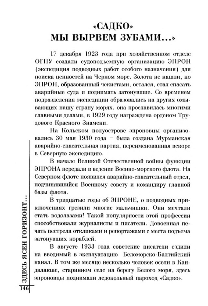 Мы едем вместе на подъём «Садко». Он, Шишков и я. Но ему мало было только этого подъёма. Он изменил весь маршрут, нарушил все планы начальника ЭПРОНа Ф.И. Крылова. Бело-морканал, пристани, шлюзы, капитаны, чекисты, заключённые, консервные фабрики Кандалакши, океанографические станции, совхоз «Имандра», опытные полярные поля, Хибины, апатиты, гор-норабочие, инженеры, старообрядческие деревни на Выге – всё необходимо ему, кроме водолазов и кроме подъёма парохода, затонувшего ещё в годы первой империалистической войны.