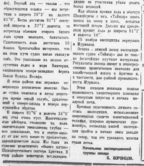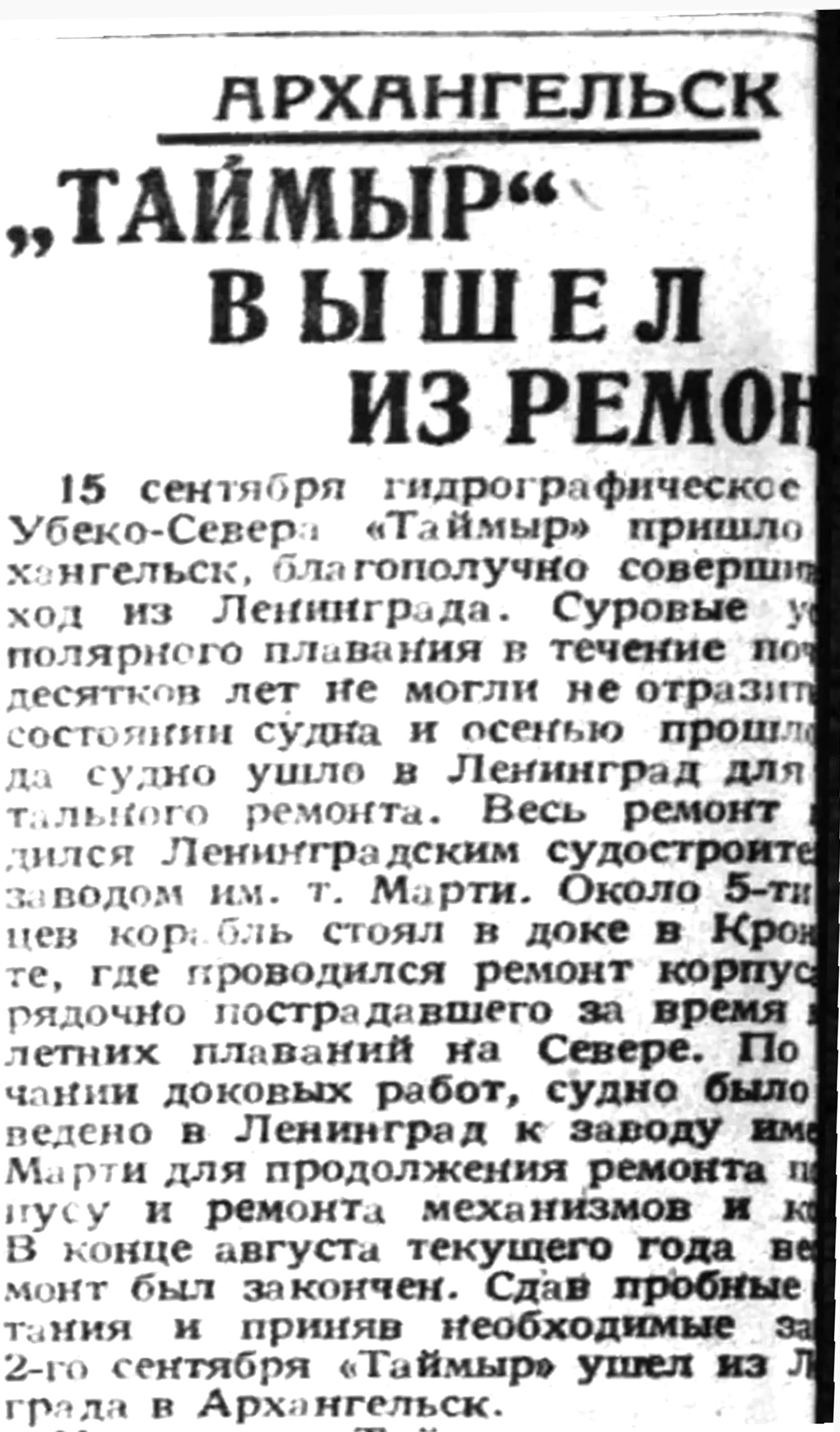 15 сентября гидрографическое [судно] Убеко-Севера "Таймыр" пришло [в Ар]хангельск, благополучно совершив [пере]ход из Ленинграда. Суровые ус[ловия] полярного плавания в течение поч[ти двух] десятков лет не могли не отразить[ся на] состоянии судна и осенью прошло[го го]да судно ушло в Ленинград для [капи]тального ремонта. Весь ремонт [произво]дился Ленинградским судостроите[льным] заводом им. т. Марти. Около 5-ти [меся]цев корабль стоял в доке в Крон[штад]те, где проводился ремонт корпуса [по]рядочно пострадавшего за время [много]летних плаваний на Севере. По [окон]чании доковых работ, судно было [пере]ведено в Ленинград к заводу име[ни] Марти для продолжения ремонта по [кор]пусу и ремонта механизмов и ко[тлов]. В конце августа текущего года ве[сь ре]монт был закончен. Сдав пробные [испы]тания и приняв необходимые за[пасы] 2-го сентября "Таймыр" ушел из Л[енин]града в Архангельск.