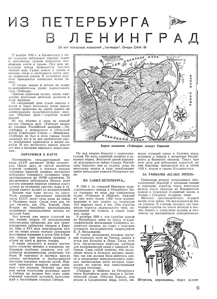Не все обычно в этом на первый взгляд обычном деле. «Таймыр» вышел из столицы Российской империи — Петербурга, а возвратился в областной центр Советского Союза — Ленинград. «Таймыр» не был в этом городе более двадцати лет и за два десятилетия много необычного произошло в жизни корабля. И это необычное навеки внесло его имя в историю мирового мореплавания...