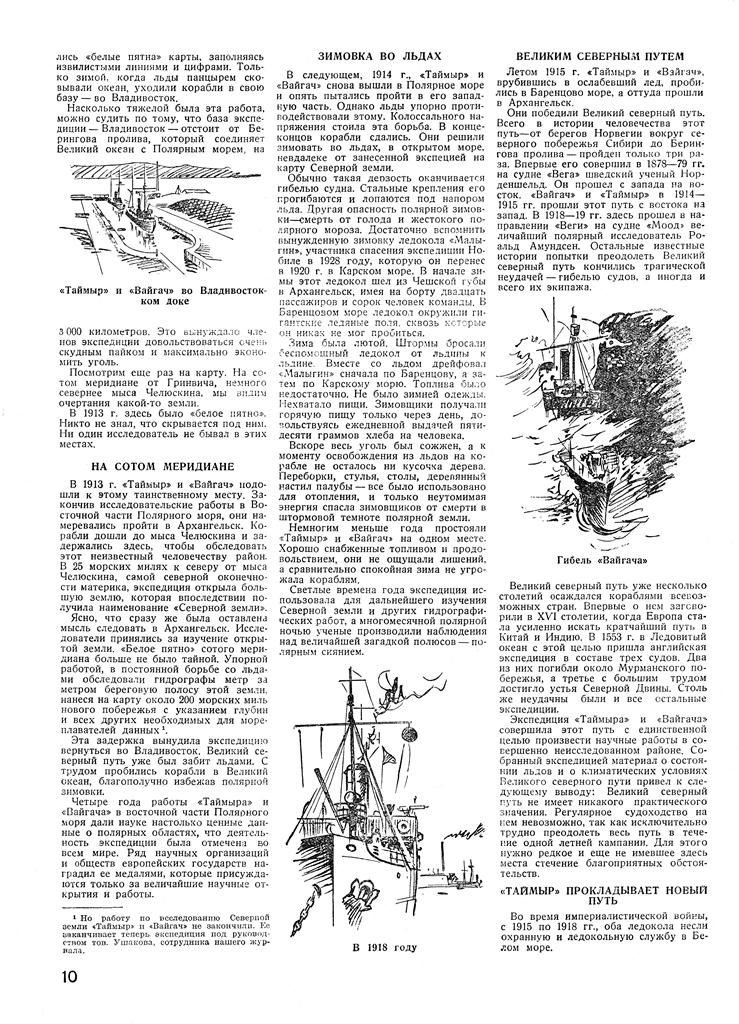 Они победили Великий северный путь. Всего в истории человечества этот путь — от берегов Норвегии вокруг северного побережья Сибири до Берингова пролива — пройден только три раза. Впервые его совершил в 1878—-79 гг. на судне «Вега» шведский ученый Норденшельд. Он прошел с запада на восток, «Вайгач» и «Таймыр» в 1914—1915 гг, прошли этот путь с востока на запад. В 1918—19 гг. здесь прошел в направлении «Веги» на судне «Моод» величайший полярный исследователь Роальд Амундсен. Остальные известные истории попытки преодолеть Великий северный путь кончились трагической неудачей —- гибелью судов, а иногда и всего их экипажа.