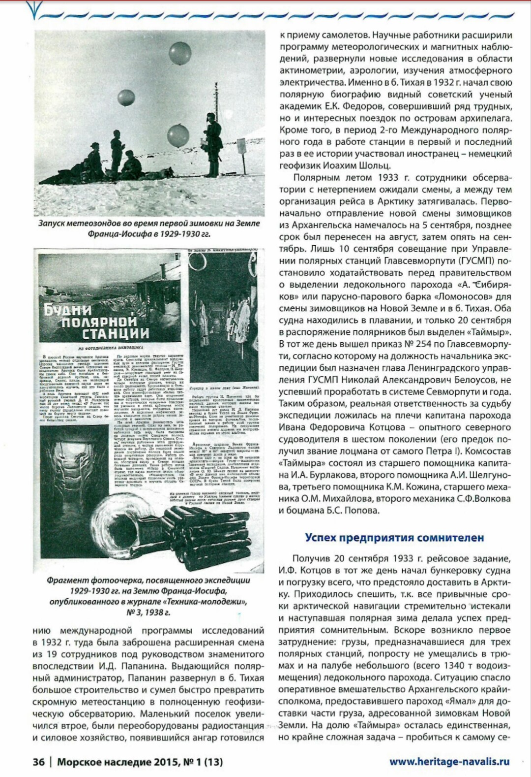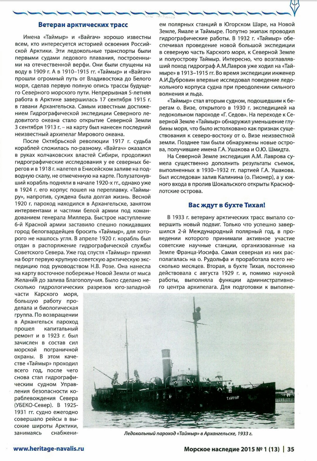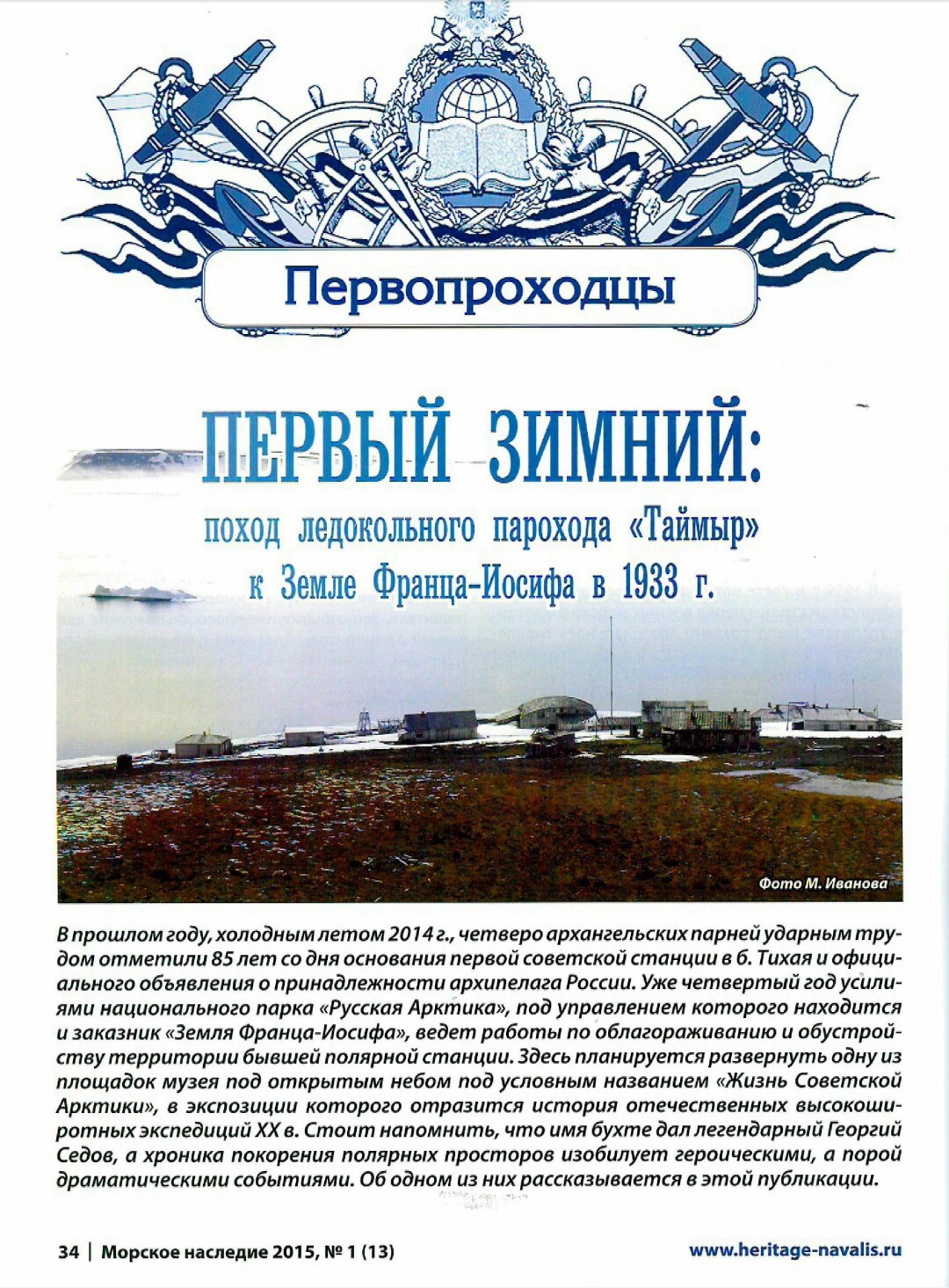 "Первый зимний: поход ледокольного парохода "Таймыр" к Земле Франца-Иосифа в 1933 г. // "Морское наследие", № 1, 2015 г., сс.34-43.