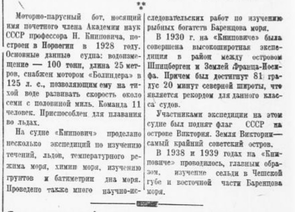 Участник! экспедиции рассказывают, что первый рейс "Николая Книпович" дал блестящие результаты, так как судну удалось, впервые ва все существование Биологической станции, дойти по Кольскому меридиану до 78° северной широты. Собран обильный и весьма ценный научный материал. Новое судно показало прекрасные качества корпуса, мотора и всего находящегося ва нем научного оборудования.