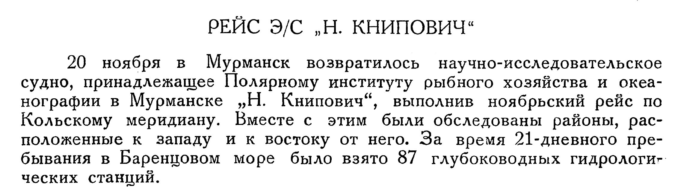 20 ноября в Мурманск возвратилось научно-исследовательское судно, принадлежащее Полярному институту рыбного хозяйства и океа­нографии в Мурманске "Н. Книпович", выполнив ноябрьский рейс по Кольскому меридиану. Вместе с этим были обследованы районы, рас­положенные к западу и к востоку от него. За время 21-дневного пре­бывания в Баренцовом море было взято 87 глубоководных гидрологических станций.