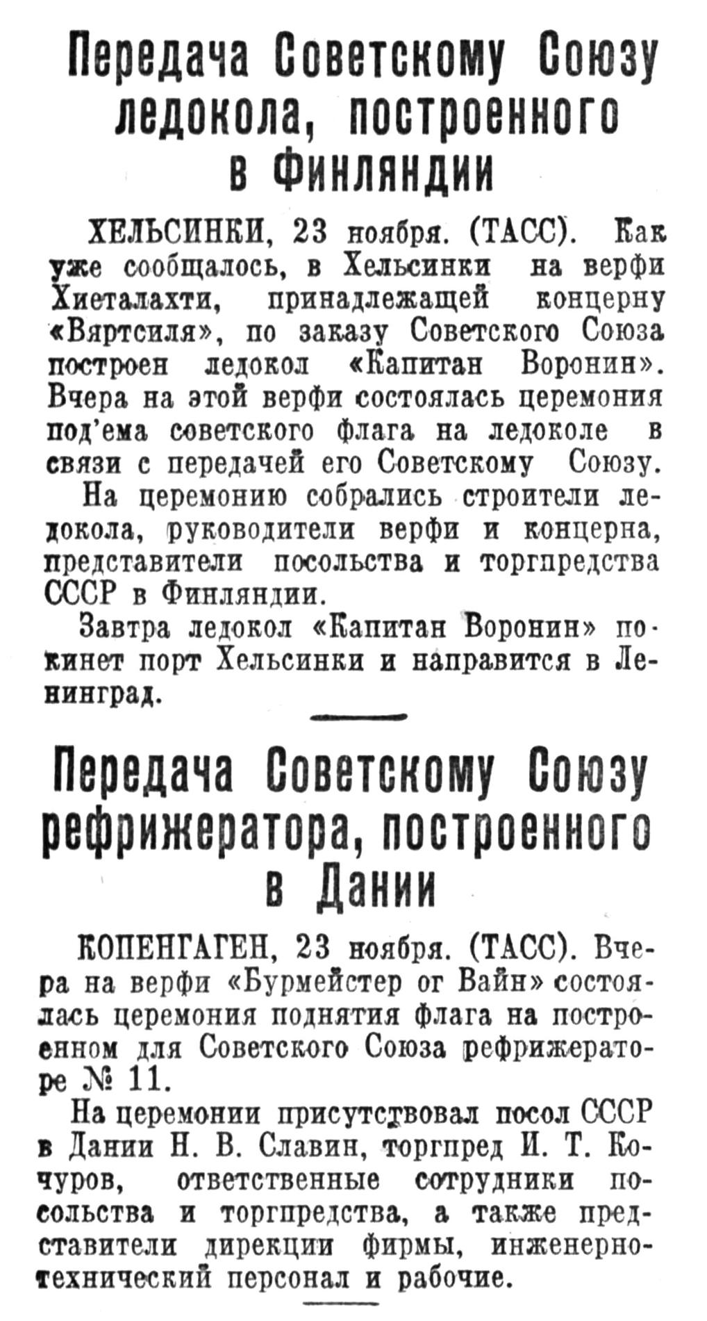 ХЕЛЬСИНКИ, 23 ноября. (ТАСС). Как уже сообщалось, в Хельсинки на верфи Хиеталахти, принадлежащей концерну «Вяртсиля», по заказу Советского Союза построен ледокол «Капитан Воронин». Вчера на этой верфи состоялась церемония подъема советского флага на ледоколе в связи с передачей его Советскому Союзу.