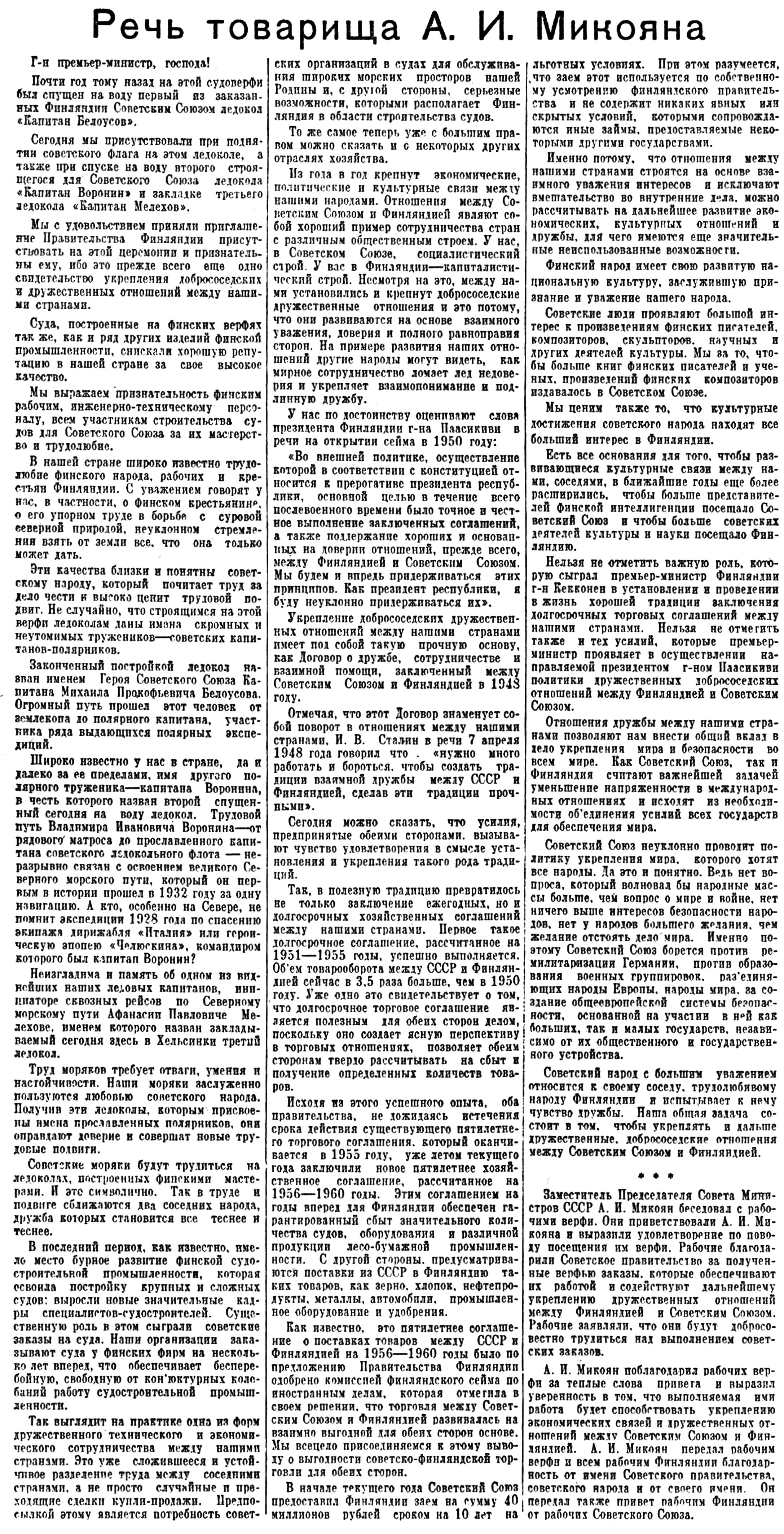 Нельзя не отметить важную роль, которую сыграл премьер-министр Финляндии г-н Кекконен в установлении и проведении в жизнь хорошей традиции заключения долгосрочных торговых соглашений между нашими странами. Нельзя не отметить также и тех усилий, которые премьер-министр проявляет в осуществлении направляемой президентом г-ном Паасикиви политики дружественных добрососедских отношений между Финляндией и Советским Союзом.