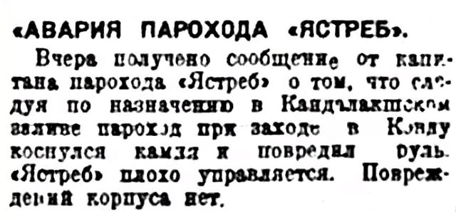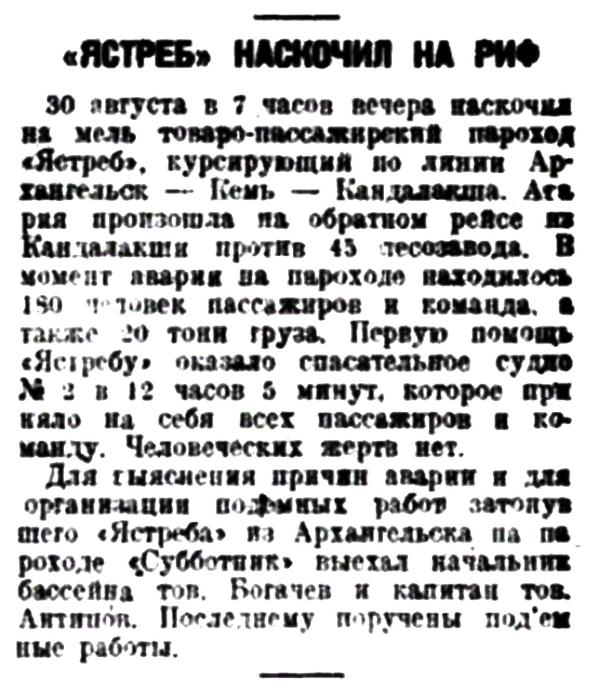 30 августа в 7 часов вечера наскочил на мель товаро-пассажирский пароход "Ястреб", курсирующий по линии Архангельск — Кемь — Кандалакша. Авария произошла на обратном рейсе из Кандалакши против 45 лесозавода. В момент аварии на пароходе находилось 180 человек пассажиров и команда, а также 20 тонн груза. Первую помощь "Ястребу" оказало спасательное судно № 2 в 12 часов 5 минут, которое приняло на себя всех пассажиров и команду. Человеческих жертв нет.