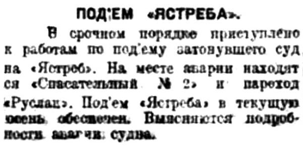 В срочном порядке приступлено к работам по подъёму затонувшего судна "Ястреб". На месте аварии находится "Спасательный №2" и пароход "Руслан". Подъем "Ястреба" в текущую осень обеспечен. Выясняются подробности аварии судна.