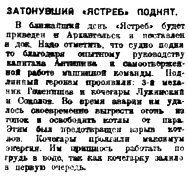 В ближайшие день "Ястреб" будет приведен в Архангельск и поставлен и док. Надо отметить, что судно поднято благодаря опытному руководству капитана Антипина и самоотверженной работе машинной команды. Подлинный героизм проявили: 3-й механик Голенищев и кочегары Лужинский и Соколов. Во время аварии им удалось своевременно выгрести огонь из топок и освободить котлы от пара. Этим был предотвращен взрыв котлов. Кочегары проявили максимум энергии. Им пришлось работать по грудь в воде, так как кочегарку залило в первую очередь.