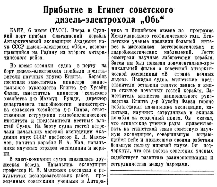 КАИР, 6 июня (ТАСС). Вчера в Суэцкий порт прибыл флагманский корабль Антарктической экспедиции Академии наук СССР дизель-электроход «Обь», возвращающийся на Родину из второго антарктического рейса.