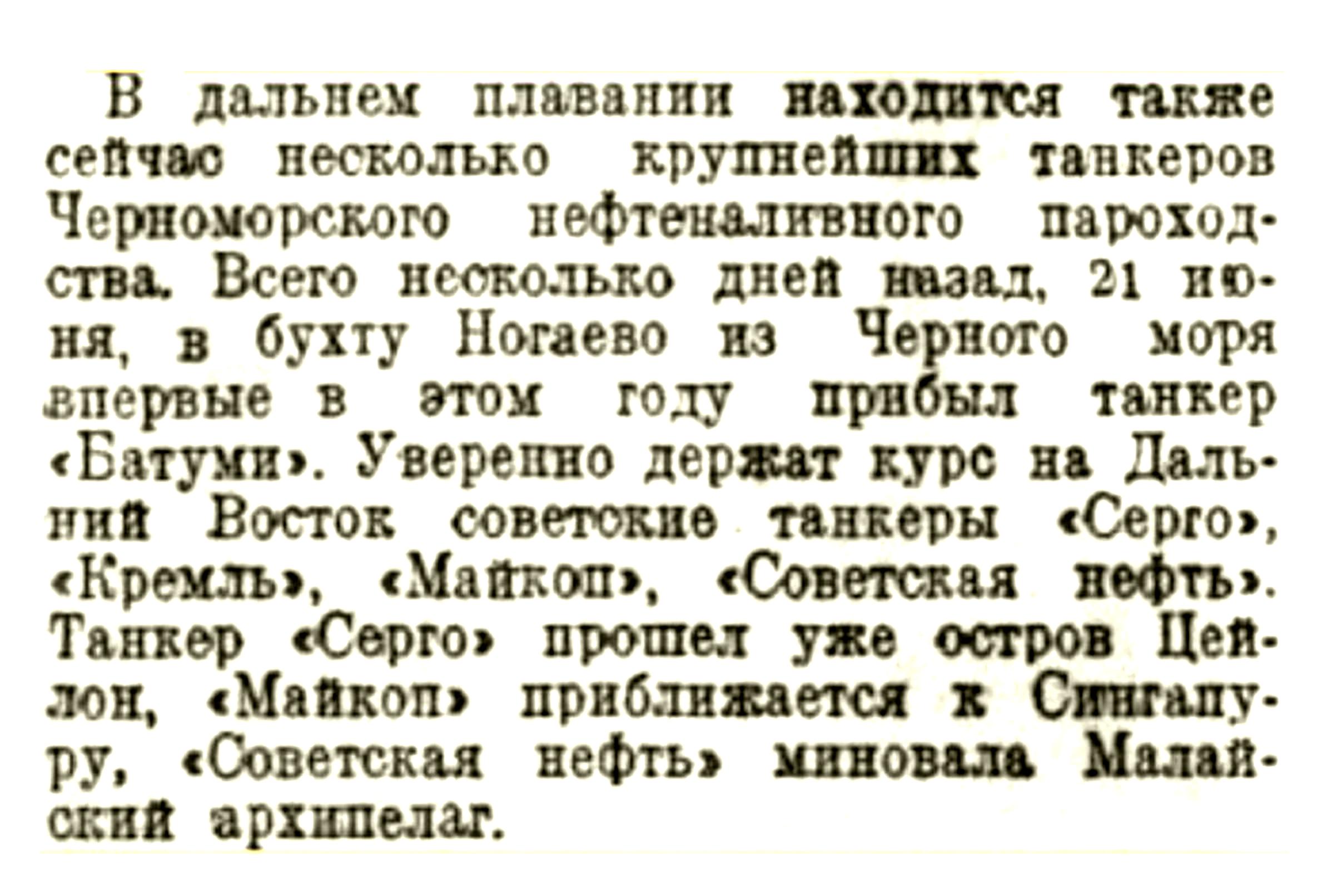 Следует сказать, что И.В, Сталин внимательно следил за деятельностью советских пароходов в Тихом океане и болезненно воспринимал сообщения о гибели того или иного судна. Успехам же, наоборот, радовался и даже, по возможности, лично благодарил капитанов за проявленное мужество и героизм. Вот пример одного из таких общений И.В. Сталина с одним из капитанов дальневосточного пароходства, описанный в воспоминаниях А.А. Афанасьевым: «Танкер «Батуми» был внезапно атакован японским самолетом на подходе к Владивостоку. Так как на танкере были установлены зенитные пулеметы, капитан танкера Зайцев дал команду обстрелять самолет. В результате японский самолет был сбит. На борт танкера прибыли местные власти и представители командования. Я вызвал из порта плавучий кран и водолазов. Спустя несколько часов самолет с японским летчиком был поднят, а Военный совет наградил капитана танкера «Батуми» и членов экипажа из тех, кто отражал налет, боевыми орденами. Танкер Батуми» под командованием капитана Зайцева работал отлично. Совершив 6 рейсов из Владивостока в США, он даже в Америке был освобожден от портовых сборов. Об этом я доложил Сталину. Вскоре мне по ВЧ позвонил А. Микоян и сказал: