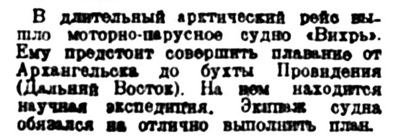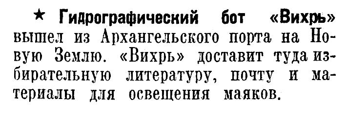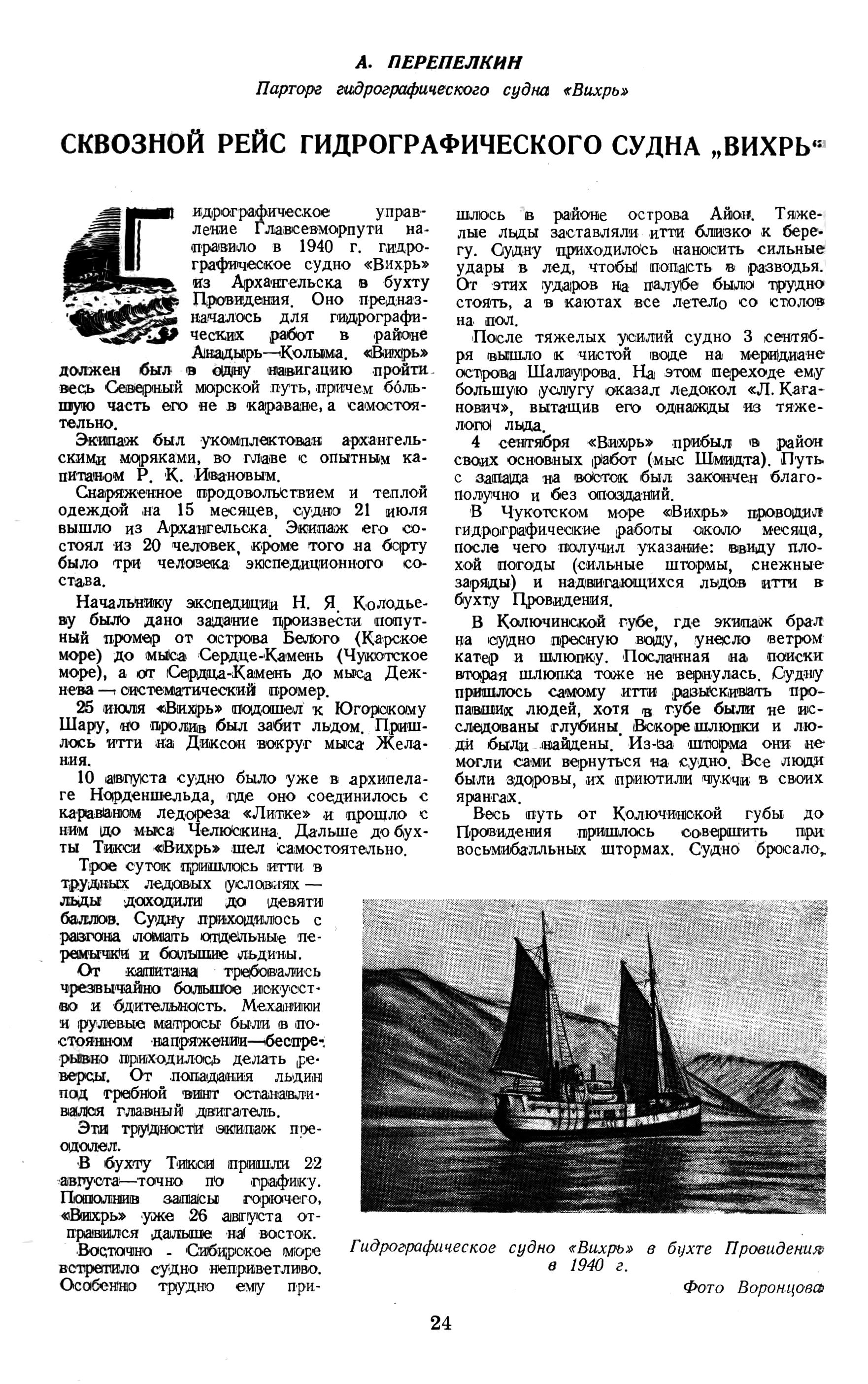 Гидрографическое управление Главсевморпути направило в 1940 г. гидрографическое судно «Вихрь» из Архангельска в бухту Провидения. Оно предназначалось для гидрографических работ в районе Анадырь — Колыма. «Вихрь» должен был в одну навигацию пройти весь Северный морской путь, причем большую часть его не в караване, а самостоятельно.