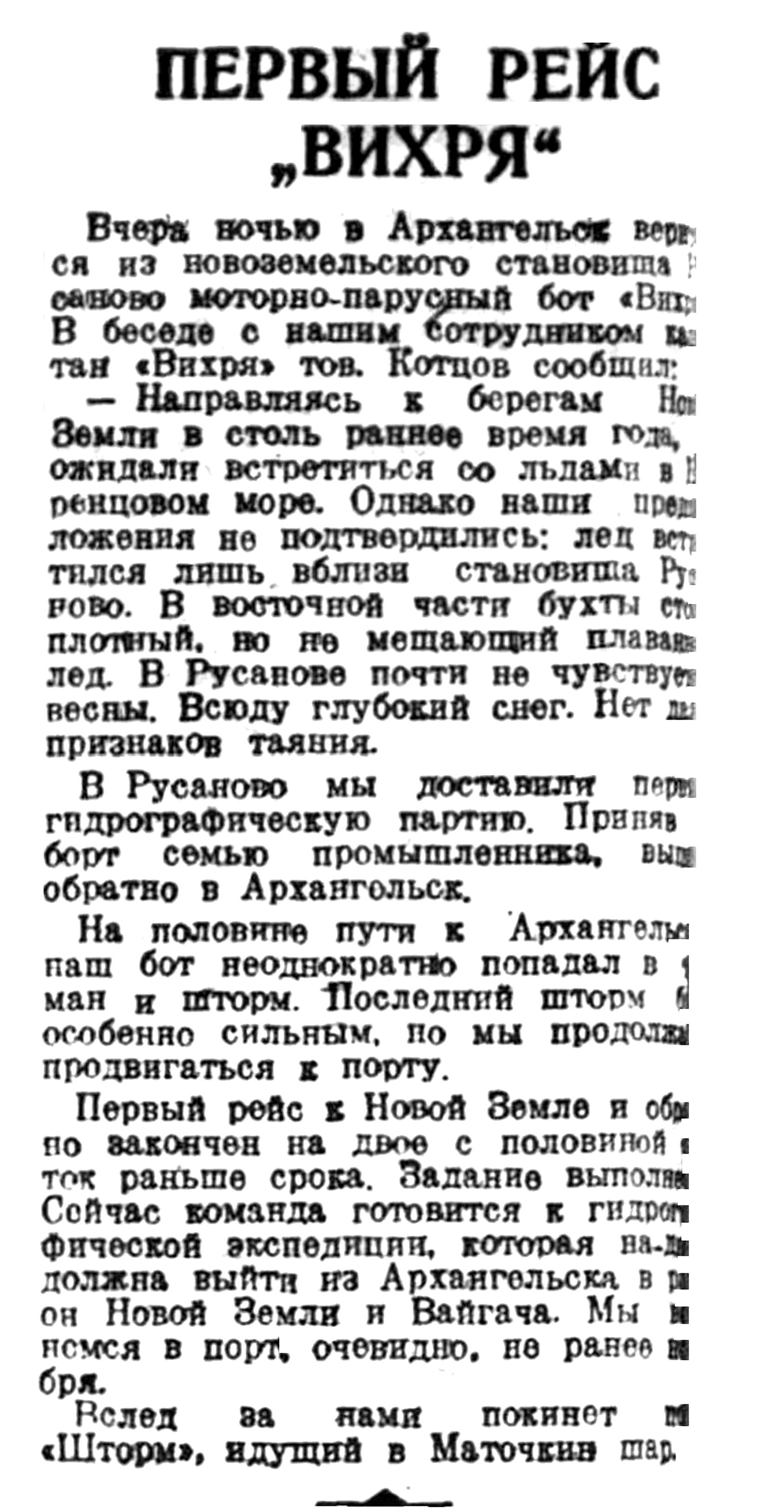 В Чукотском море «Вихрь» проводил гидрографические работы около месяца, после чего получил указание: ввиду плохой погоды (сильные штормы, снежные заряды) и надвигающихся льдов итти в бухту Провидения.