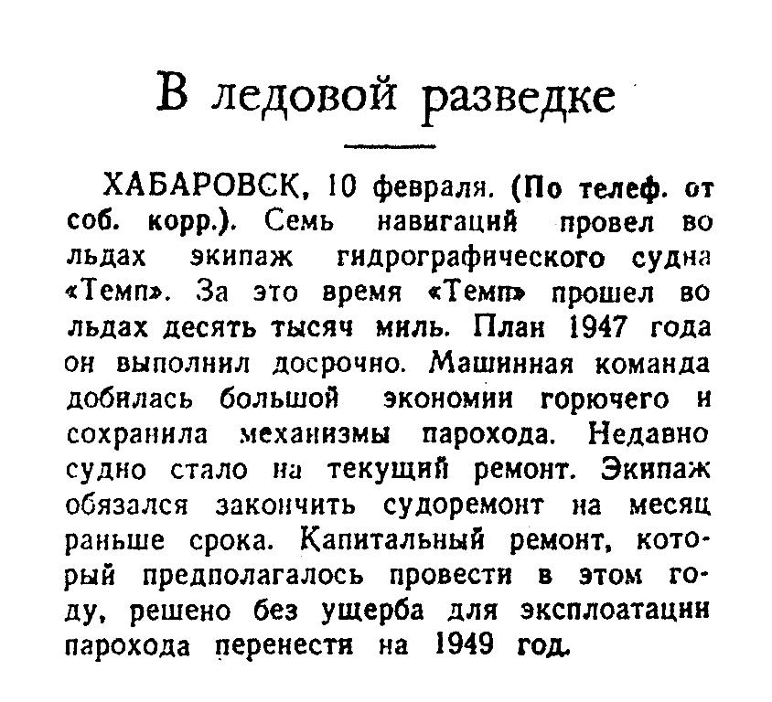 Ю. Алексеев пишет:1932-33: Северо-Восточная Полярная Экспедиция НАРКОМВОДАЭкспедиция вышла из Владивостока в июле 1932 году, не дойдя еще до Берингова пролива экспедиция встретила льды. Полетели вперед самолеты, ища проходов в казавшейся непроходимой ледяной ловушке. А по воде — вдоль ледяного барьера — вспоминает т. Алексеев — «лазала» шхуна «Темп», капитан которой установил на мостике табурет и залез на него, чтобы дальше видеть вперед...