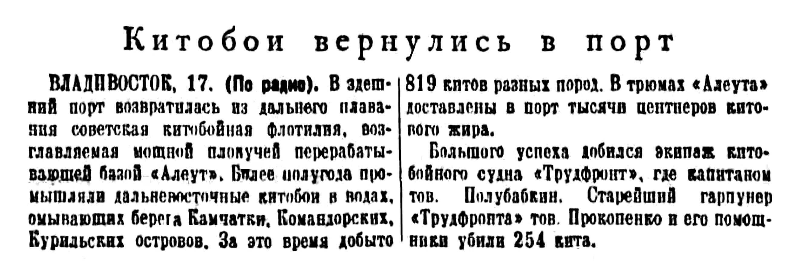 Сегодня мы печатаем корреспонденцию А. Томилина «Охота на китов», в которой автор между прочим сообщает, что в этом году советской китобойной флотилией среди других китов добыто 150 финвалов, достигающих в длину 22 метров.