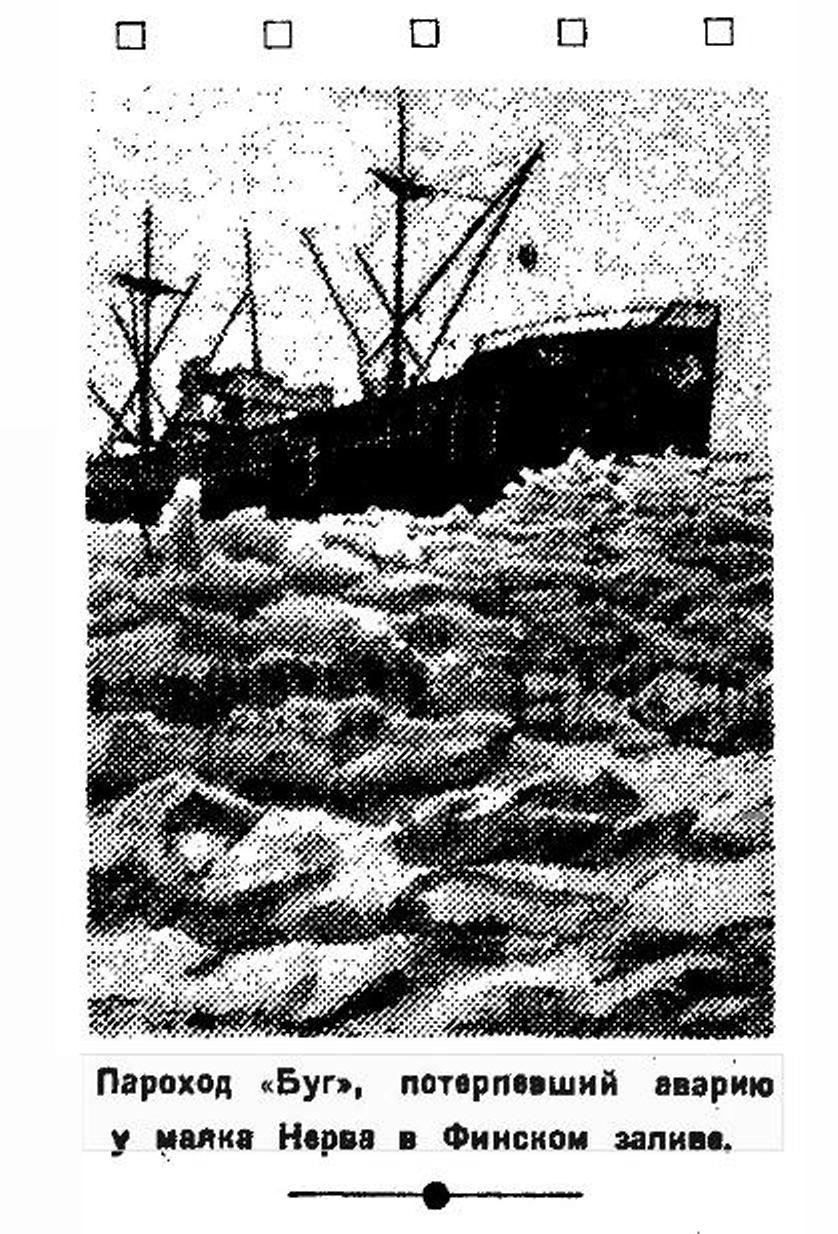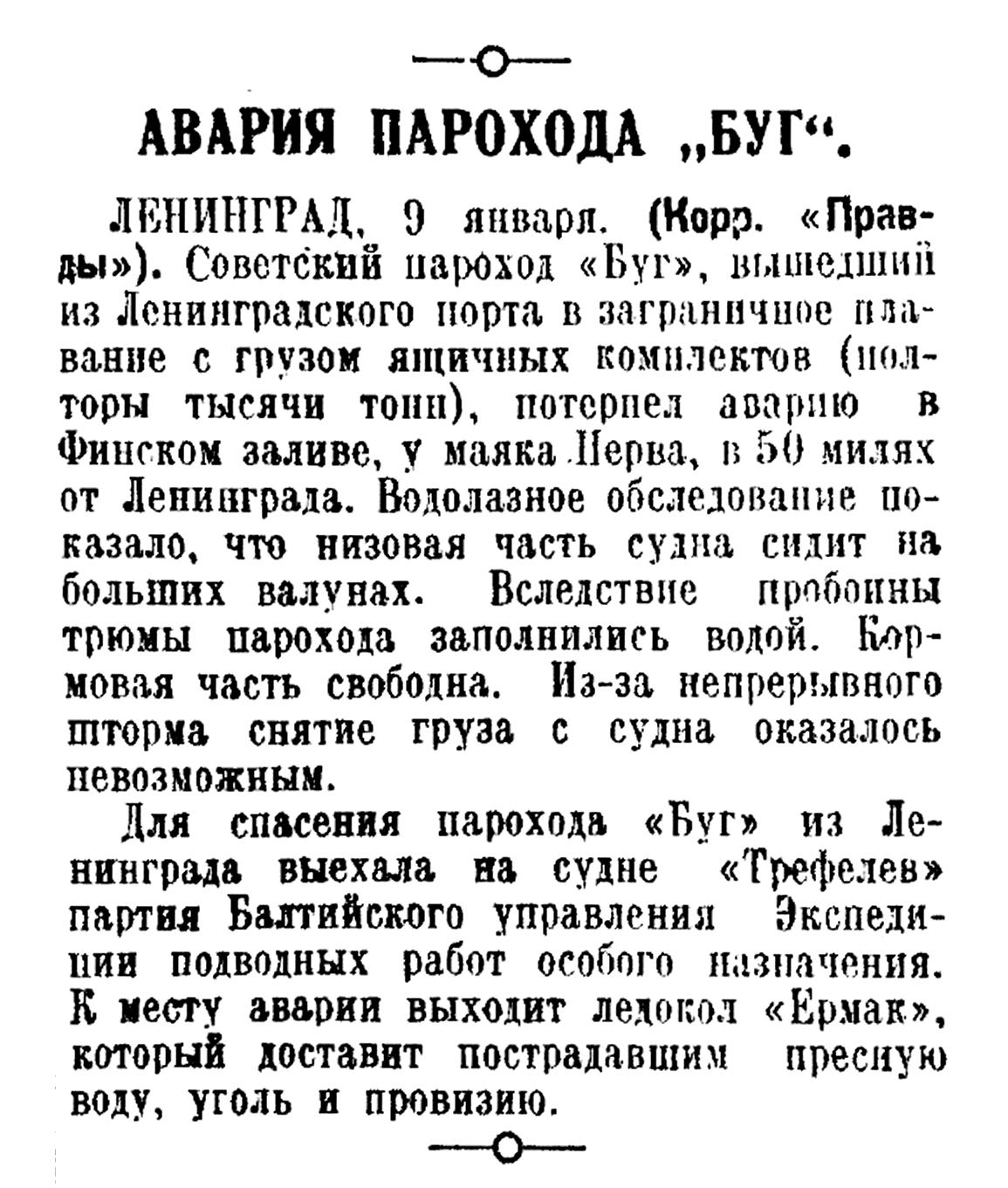 — 1 января, в час ночи, советский пароход «Буг», шедший с грузом ящиков за границу, потерпел в Финском заливе аварию. «Буг» наскочил на камни. в 50 милях от Ленинграда, около маяка Нерва.