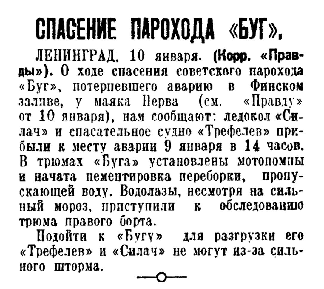 ЛЕНИНГРАД. 10 января. (Корр. «Правды»). О ходе спасения советского парохода «Буг», потерпевшего аварию в Финском заливе, у маяка Нерва (см. «Правду» от 10 января), нам сообщают: ледокол «Силач» и спасательное судно «Трефелев» прибыли к месту аварии 9 января в 14 часов. В трюмах «Буга» установлены мотопомпы и начата цементировка переборки, пропускающей воду. Водолазы, несмотря на сильный мороз, приступили к обследованию трюма правого борта.