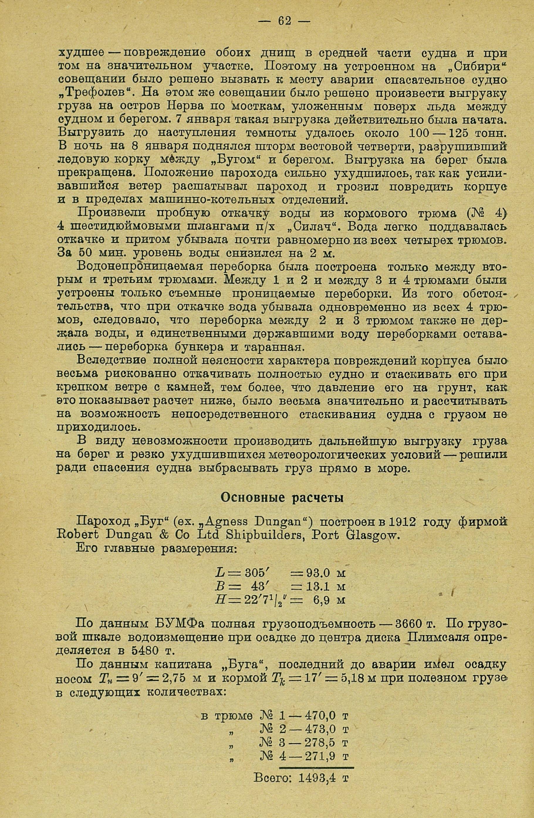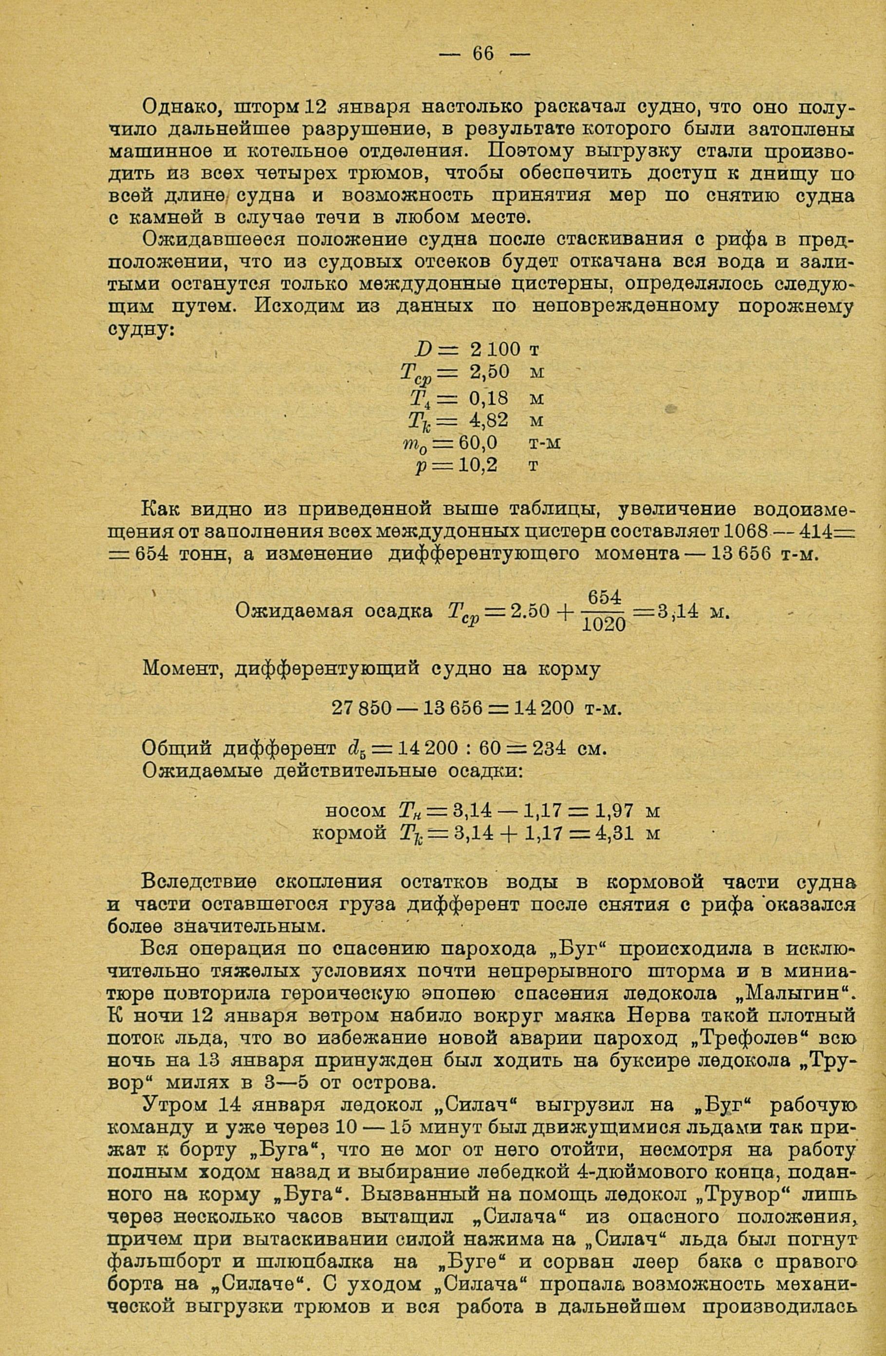 Вследствие полной неясности характера повреждений корпуса было весьма рискованно откачивать полностью судно и стаскивать его при крепком ветре с камней, тем более, что давление его на грунт, как это показывает расчет ниже, было весьма значительно и рассчитывать на возможность непосредственного стаскивания судна с грузом не приходилось.