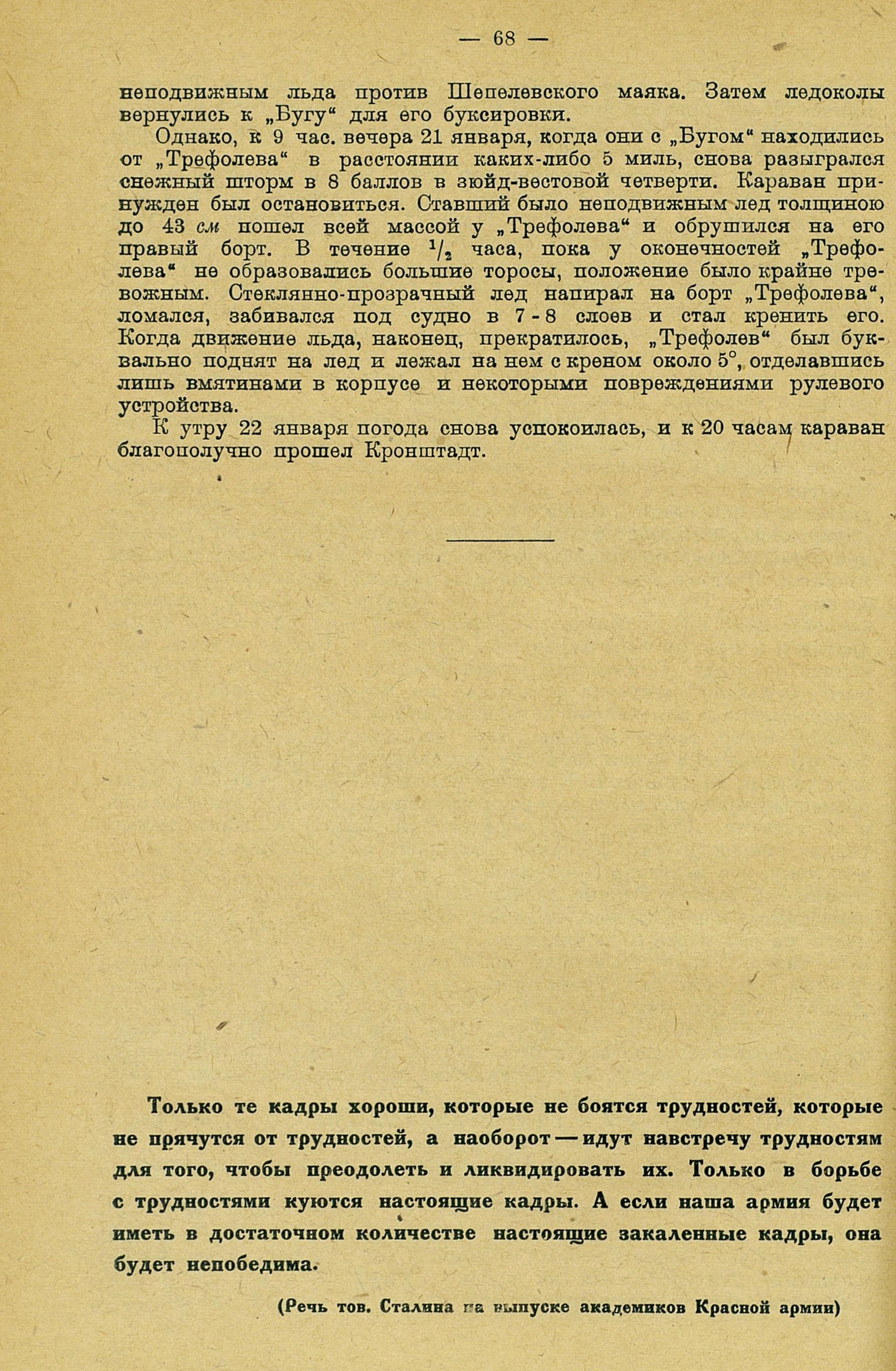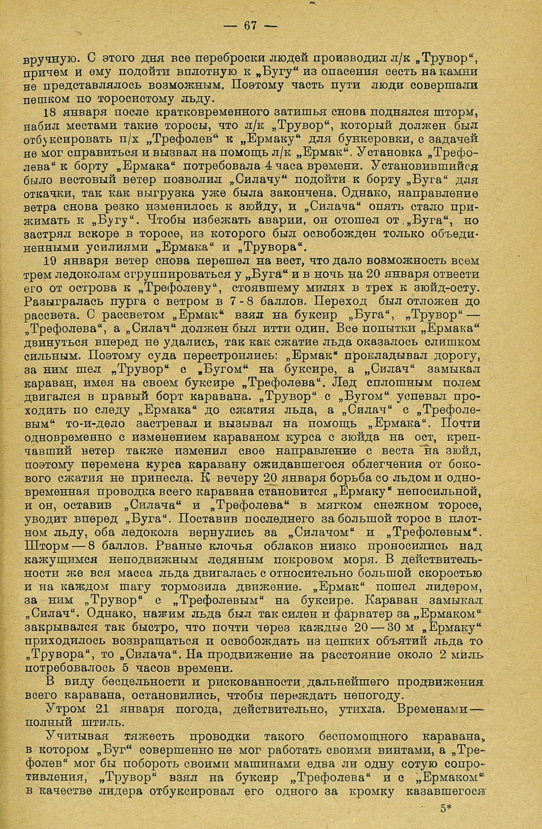«В 12 часов 20 января вышли на буксире у ледокола «Трувор» в Ленинград. Впереди идет ледокол «Ермак», прокладывающий путь сквозь сплошной торосистый лед. Дует норд-вест — четыре балла».