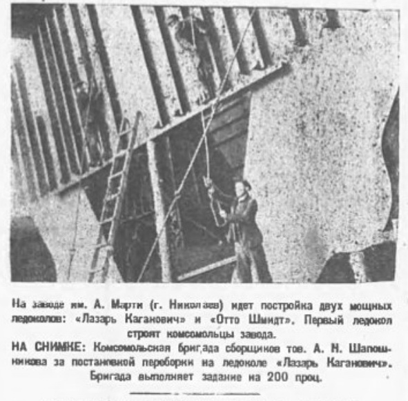 Мощный ледокол «Лазарь Каганович» принят приемочной комиссией и вступил в число действующих судов советского арктического флота. Сегодня на борту ледоколе состоялся торжественный митинг, посвященный поднятию флага Союза ССР и вымпела Главсевморпути. На митинге яркую речь произнес председатель приемочной комиссии Герой Советского Союза тов. Кренкель. От имени экипажа ледокола выступил капитан-орденоносец тов. Николаев.