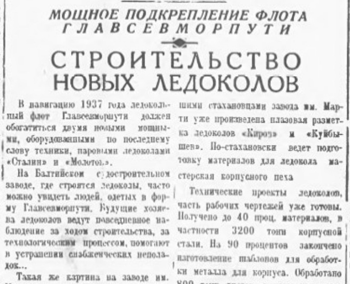 На ледоколе — председатель правительственной приемочной комиссии Герой Советского Союза тов. Кренкель. После подписания акта о приёмке ледокола на нем будет поднят Флаг Главсевморпути. Ледокол примет тысячу тонн угля и пятимесячный продовольственный запас, после чего пойдет на догрузку двух тысяч тонн угля в Одессу и оттуда отправится во Владивосток. Переход намечено провести за 42 суток.