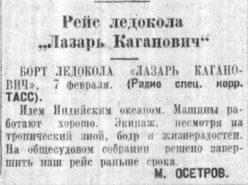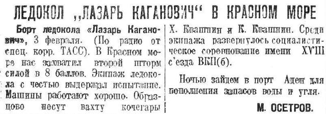 Борт ледокола «Лазарь Каганович», 3 февраля. (По радио от спец. корр. ТАСС). В Красном море нас захватил второй шторм силой в 8 баллов. Экипаж ледокола с честыо выдержал испытание. Машины работают хорошо. Образцово несут вахту кочегары X. Квашнин и К. Квашнин. Среди экипажа развернулось социалистическое соревнование имени XVIII съезда ВКП(б).