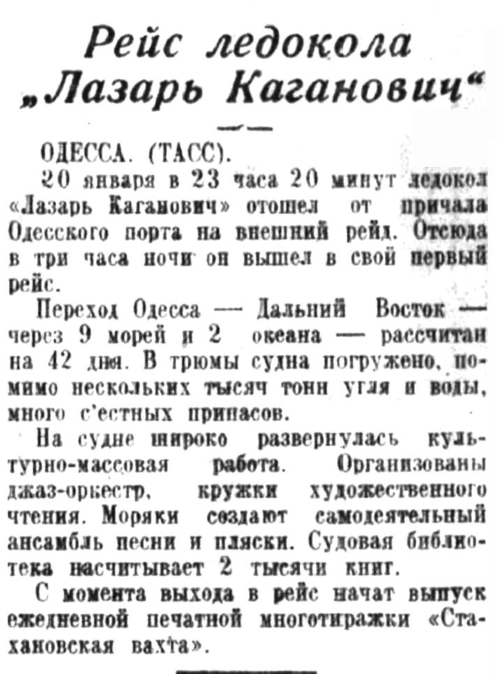 20 января в 23 часа 20 минут ледокол «Лазарь Каганович» отошел от причала Одесского порта на внешний рейд. Отсюда в три часа ночи он вышел в свой первый рейс.