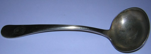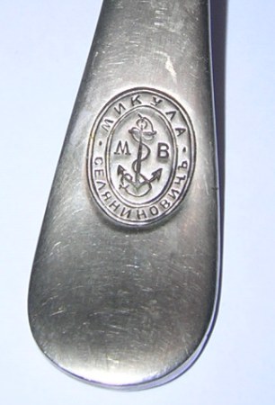Поварешка (латунь, серебрение, длина 18.5 см, надпись "Микула Селянинович МФ", начало 20 века.