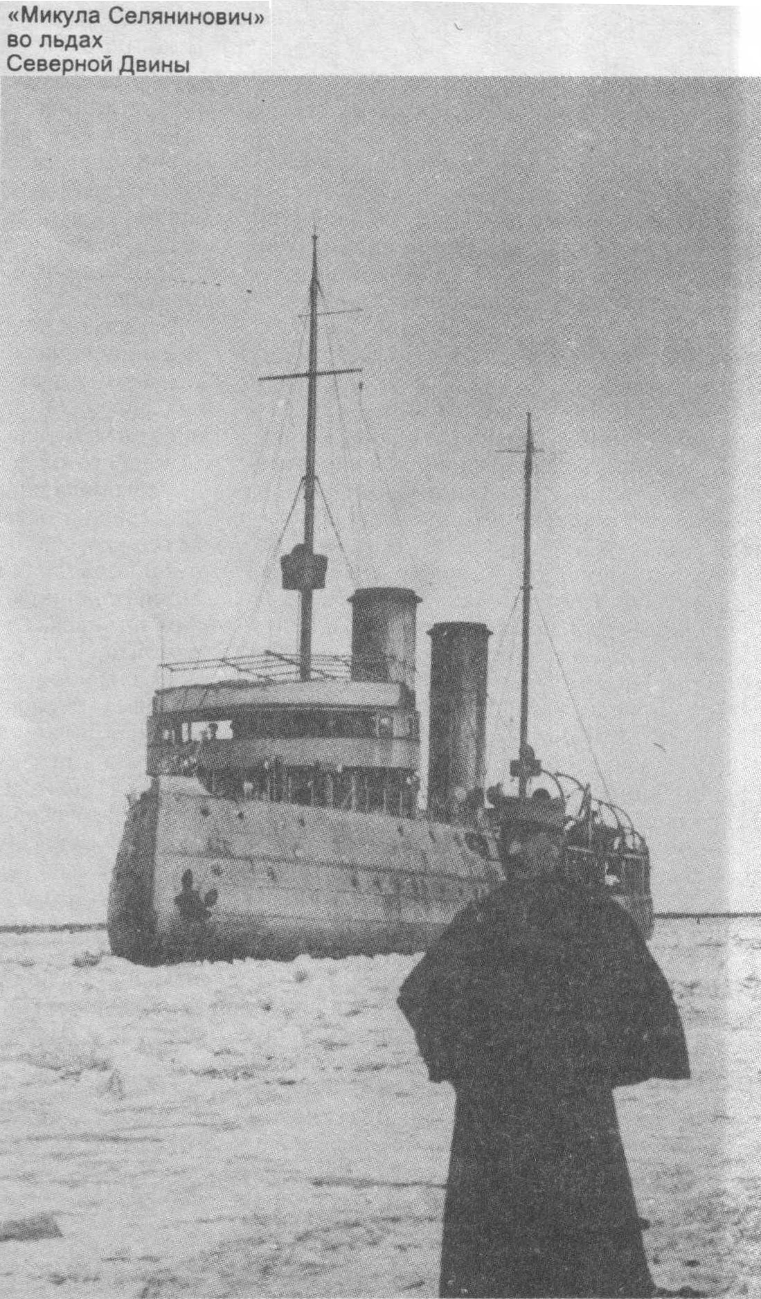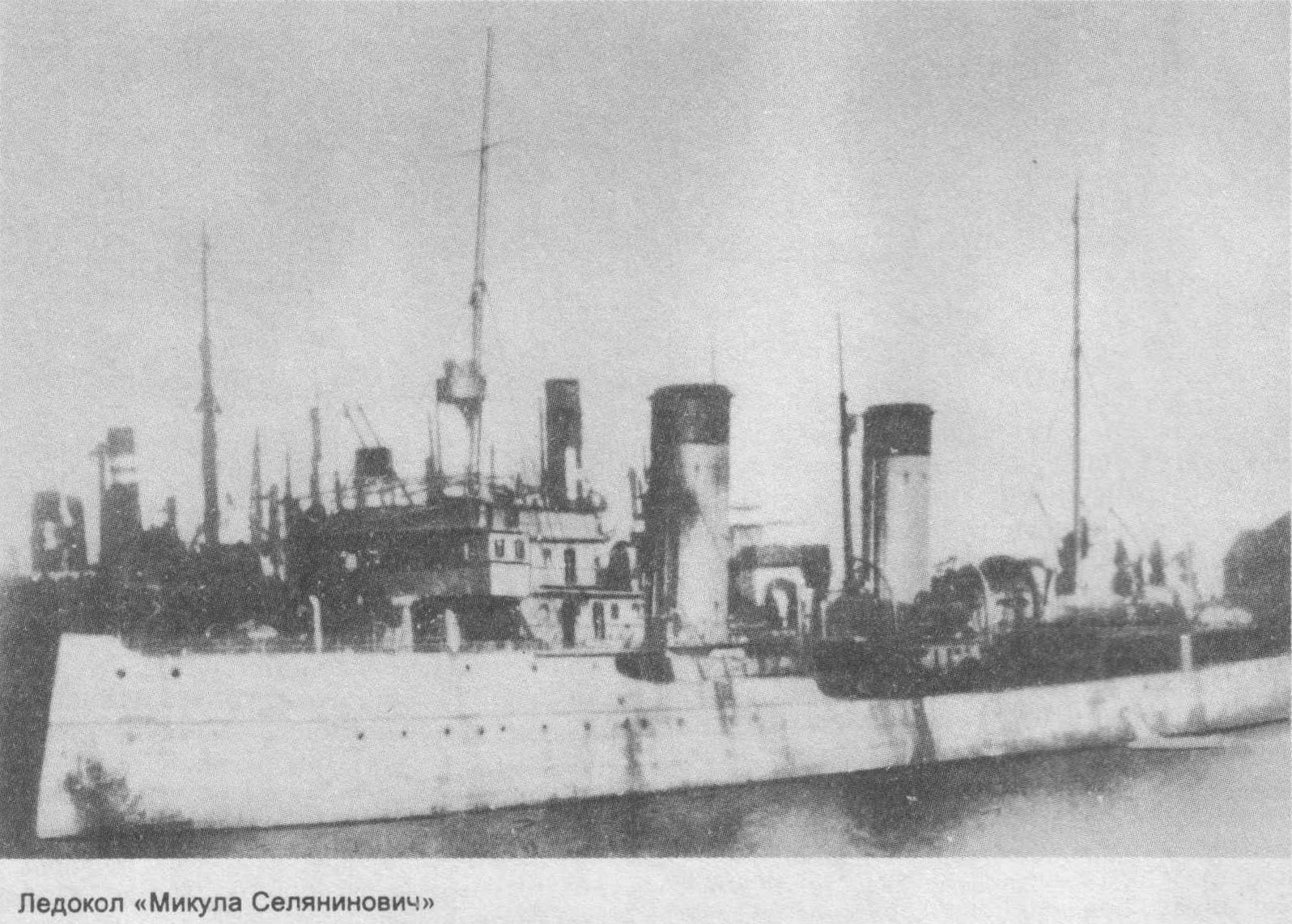 Историческая справка: ледокол "Микула Селянинович" построен в Канаде в 1916 году (первоначальное название "Дж.Д.Хейзен"), куплен Россией и вошел во Флотилию Северо-Ледовитого океана, в 1919 затоплен в связи с угрозой нападения англо-французской эскадры на Архангельск на фарватере Серверной Двины, в этом же году поднят англичанами и передан французам, вскоре разобран как вышедший из строя.
