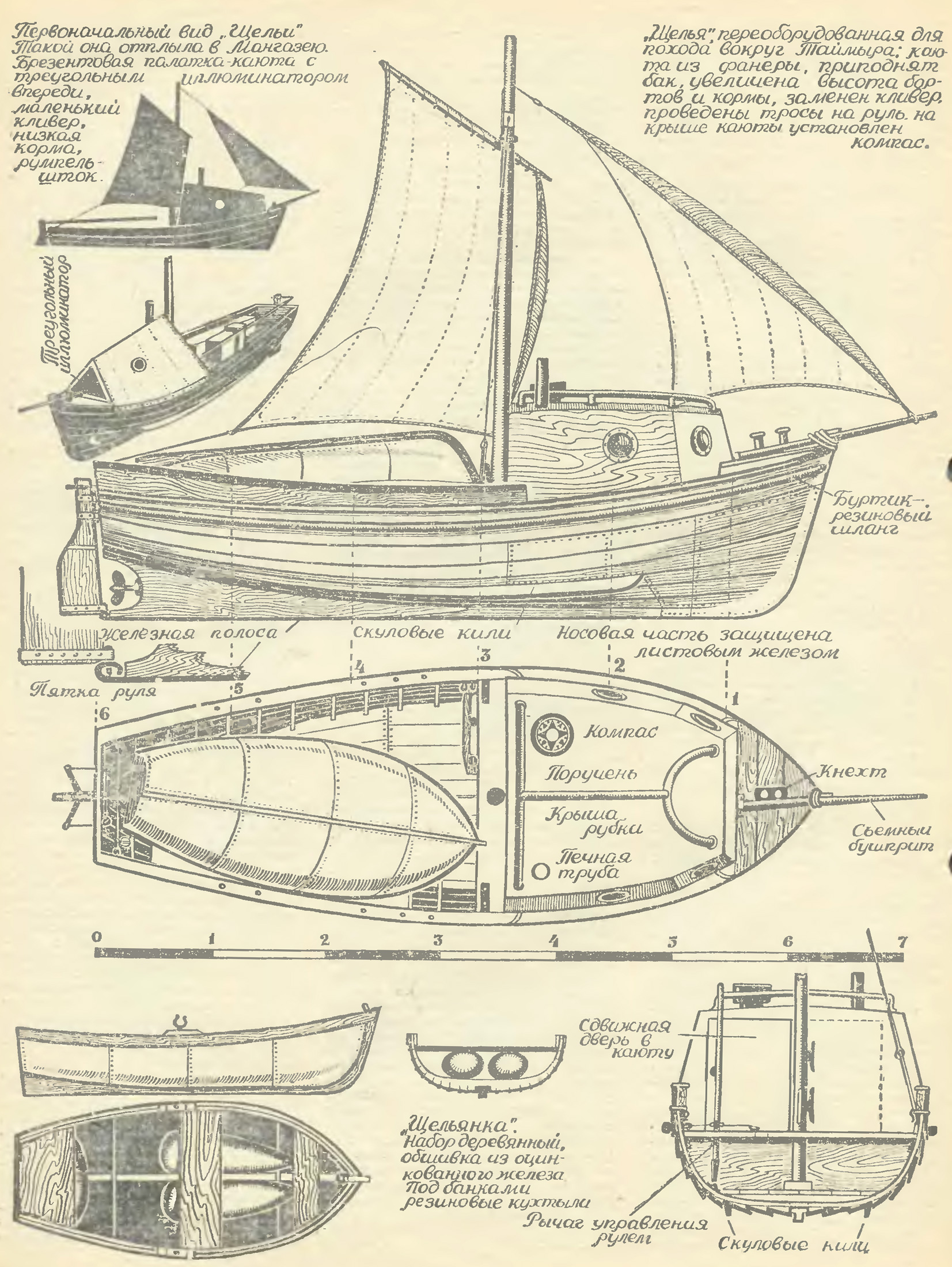 Моделистам будет интересно значь, как окрашивалась «Щелья». Поморы предпочитают смолу любой краске, поэтому борта были черные, планшир и рама треугольного иллюминатора — красные; красными были н паруса (от спасательных шлюпок). Во втором походе у нас появился белый кливер, а фальшборт н каюту окрасили шаровой краской.