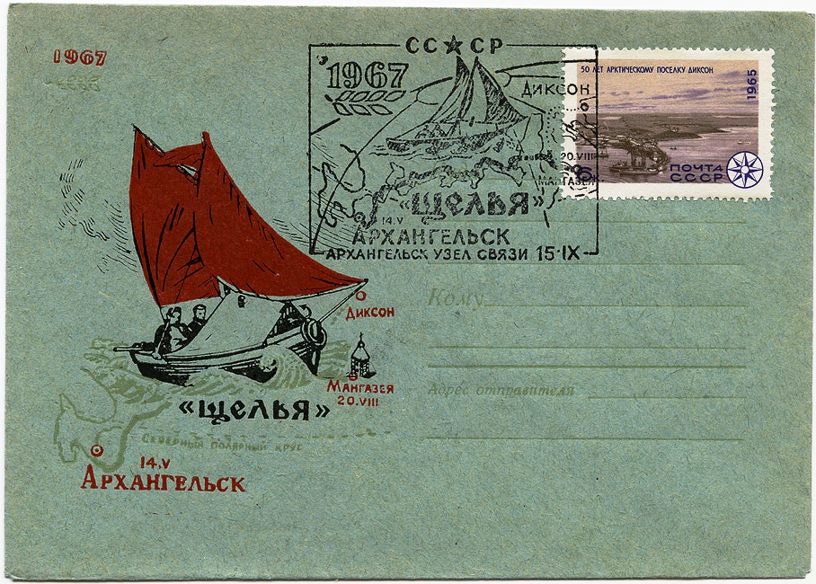 И еще в моем шкафу хранятся два конверта. Один - белый, другой - серо-голубого цвета. Рисунок на них одинаков - в левом верхнем углу обозначен год 1967; на фоне карбаса, идущего под красными парусами, схема маршрута: Архангельск 14.05 - Мангазея 20.08.