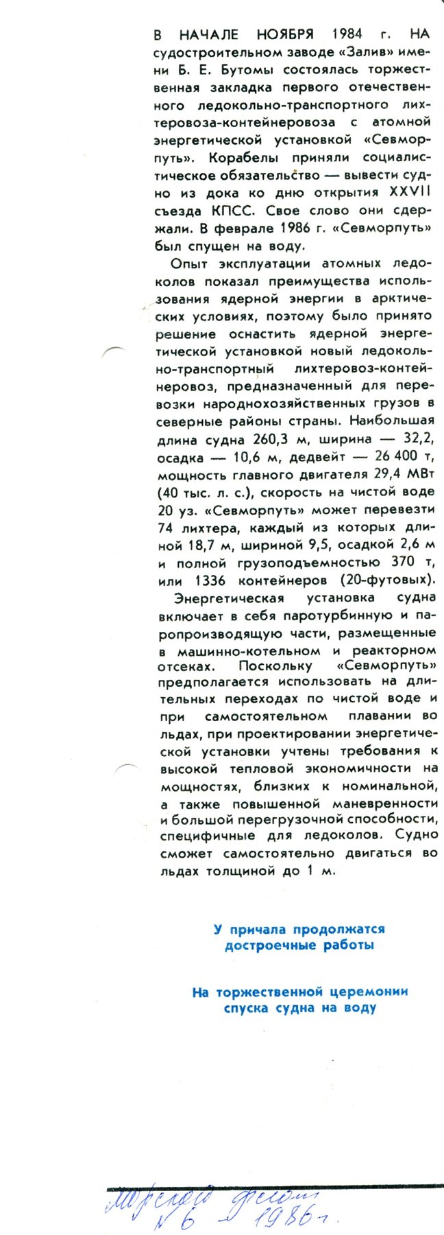 Атомный лихтеровоз-контейнеровоз «Севморпуть» - единственное в России ледокольно-транспортное судно с ядерной энергетической установкой, было построено на Керченском судостроительном заводе «Залив» им. Б.Е. Бутомы в период с 01.06.82 по 31.12.88. Проект судна разработан на основании совместного решения Минморфлота и Минсудпрома № С-13/01360 от 30.05.78 в соответствии с техническим заданием на его разработку. Корпус судна спроектирован и построен на категорию ледовых подкреплений «УЛА» в соответствии с требованиями Правил Регистра СССР изд.1981г.