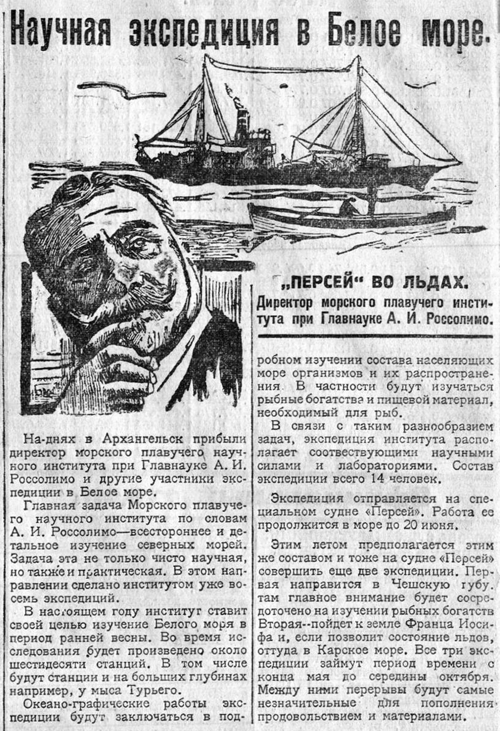 Основные даты (этапы) истории. "Персей" - первое научно-исследовательское судно Плавучего морского научного института (Плавморнина), образованного в 1921 г. В условиях разрухи, наступившей после окончания гражданской войны, институт не мог построить или купить судно, которое было крайне необходимо ему для морских исследований. Задачу эту удалось решить путем передачи институту корпуса недостроенного зверобойного судна (с названием "Персей), находящегося в Лайском доке г.Архангельска, где базировался Плавморнин.