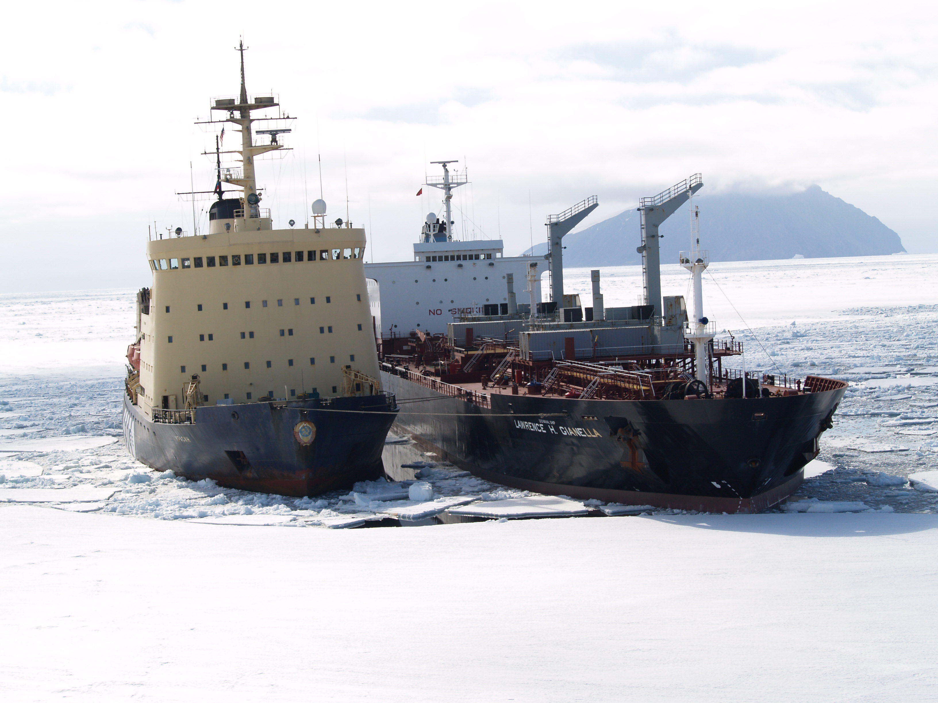 The icebreaker KRASIN and the fuel tanker GIANELLA in McMurdo Sound. The KRASIN broke open a channel in the sea ice allowing the annual fuel tanker and resupply vessel (not shown) to reach McMurdo Station, Ross Island.