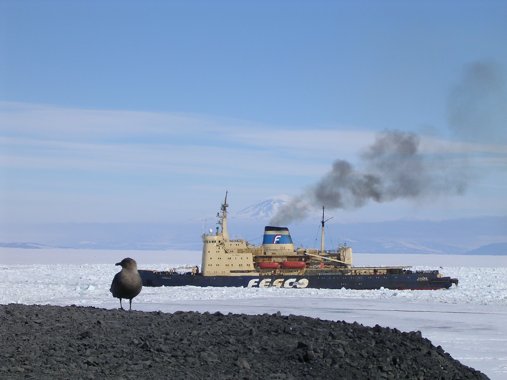 A skua sits at the edge of Hut Point , Ross Island, with the Russian KRASIN icebreaker behind it. The icebreaker will open a path in the annual sea ice to McMurdo Station, enabling a resupply ship and fuel tanker to arrive in late January-early February.