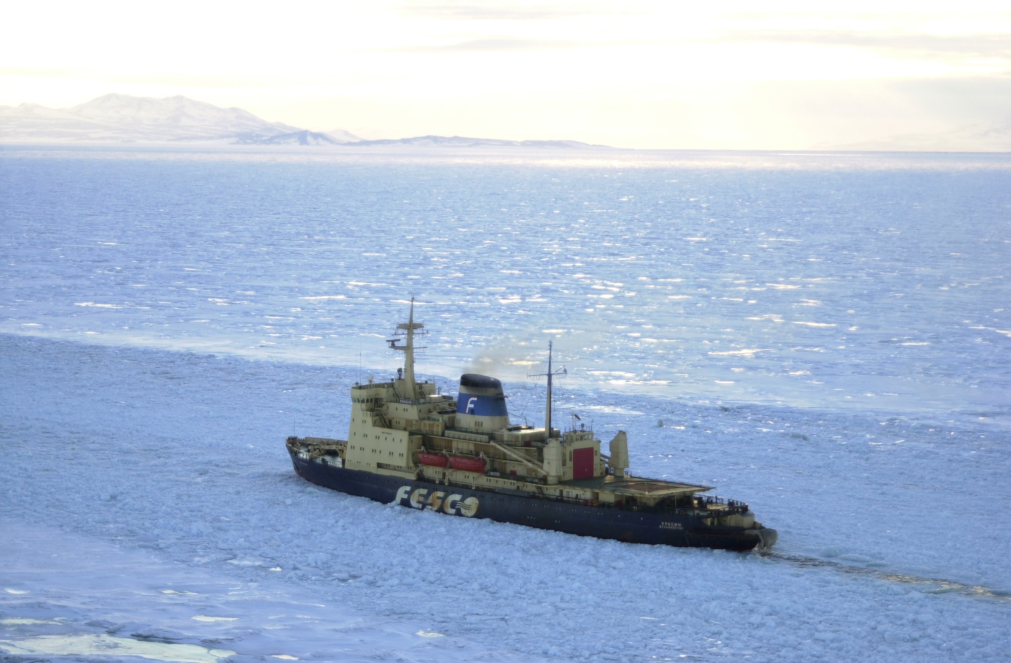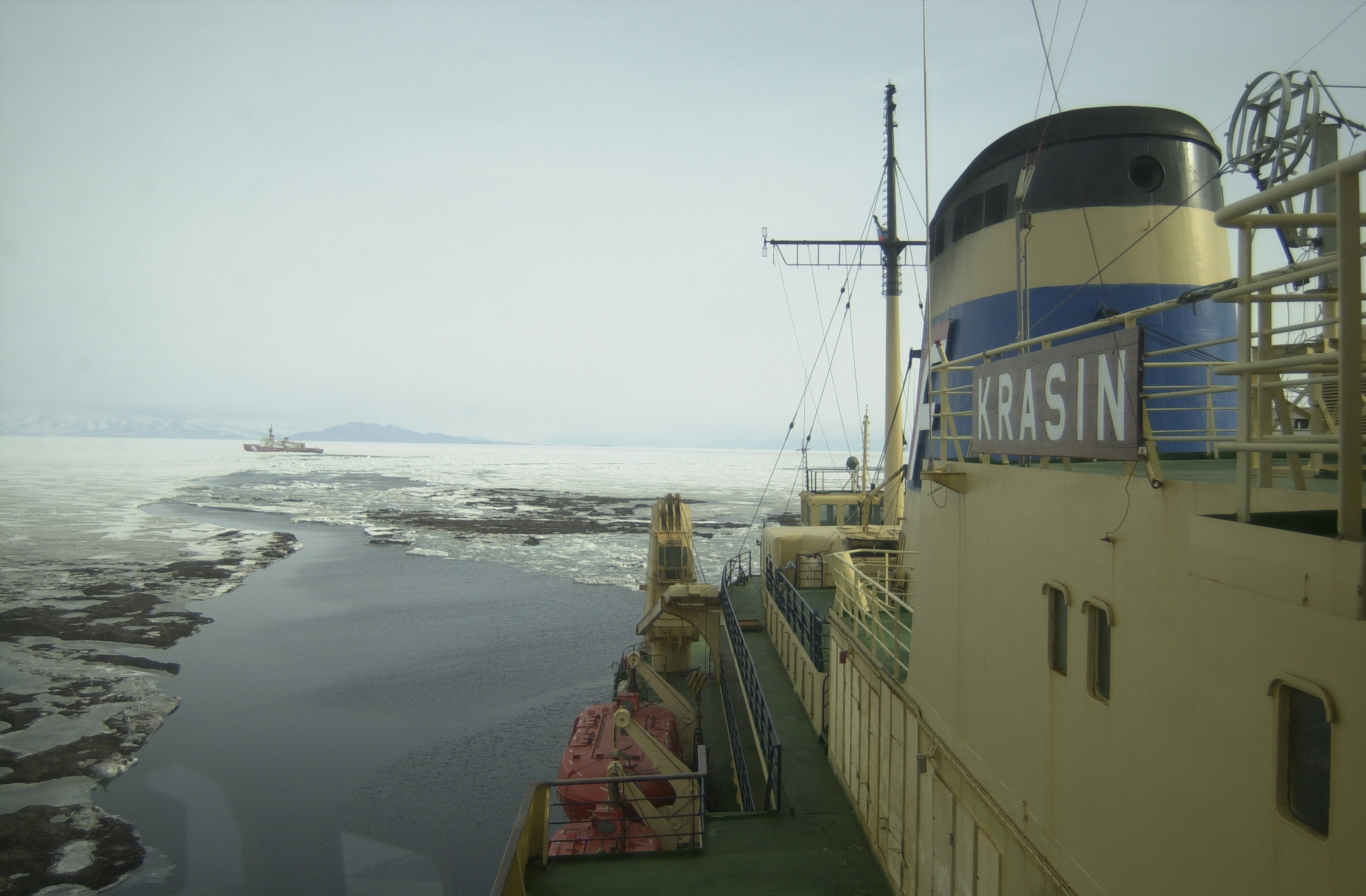 Ледоколы «Красин» и «Магадан» выполняют экспериментальную проводку через льды Татарского пролива в порт Де-Кастри танкера Приморского морского пароходства «Приморье» грузоподъемностью 105 тыс. тонн, что на практике доказывает возможность транспортировки углеводородного сырья в зимнее время.