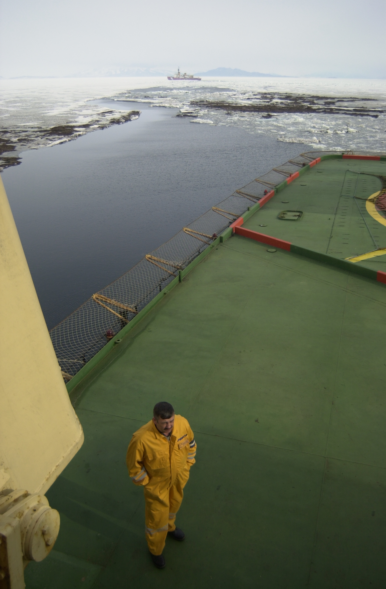 A Russian crewman stands on the deck of the icebreaker KRASIN with the U.S. Coast Guard icebreaker POLAR STAR visible in the distance.