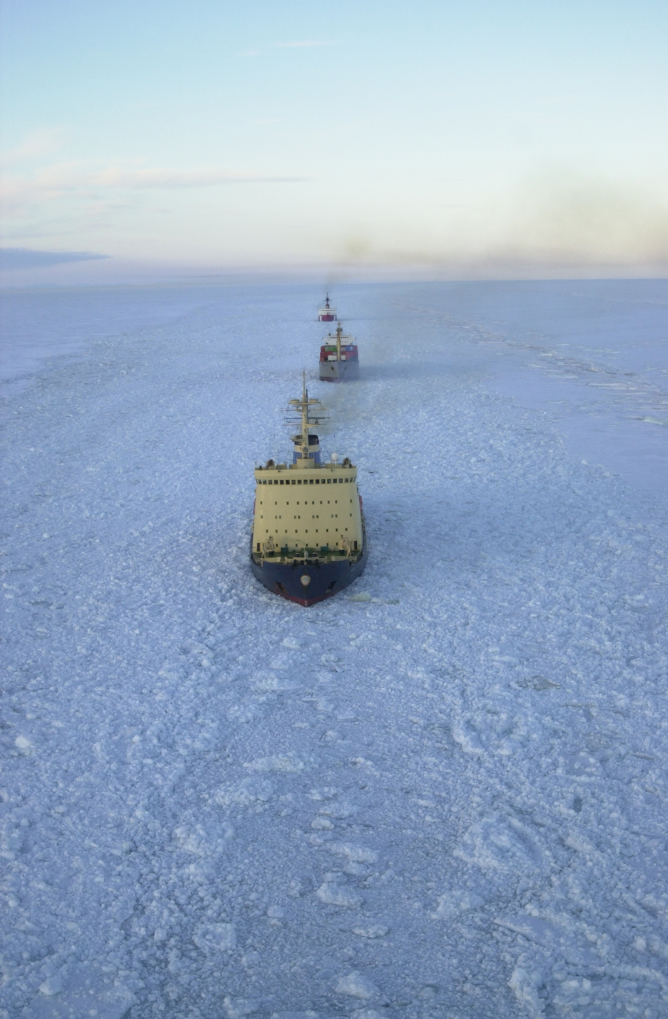 The Russian icebreaker KRASIN leads the way through a channel in the McMurdo Sound sea ice at 1 A.M., followed by the cargo vessel AMERICAN TERN and the U.S. Coast Guard icebreaker POLAR STAR.