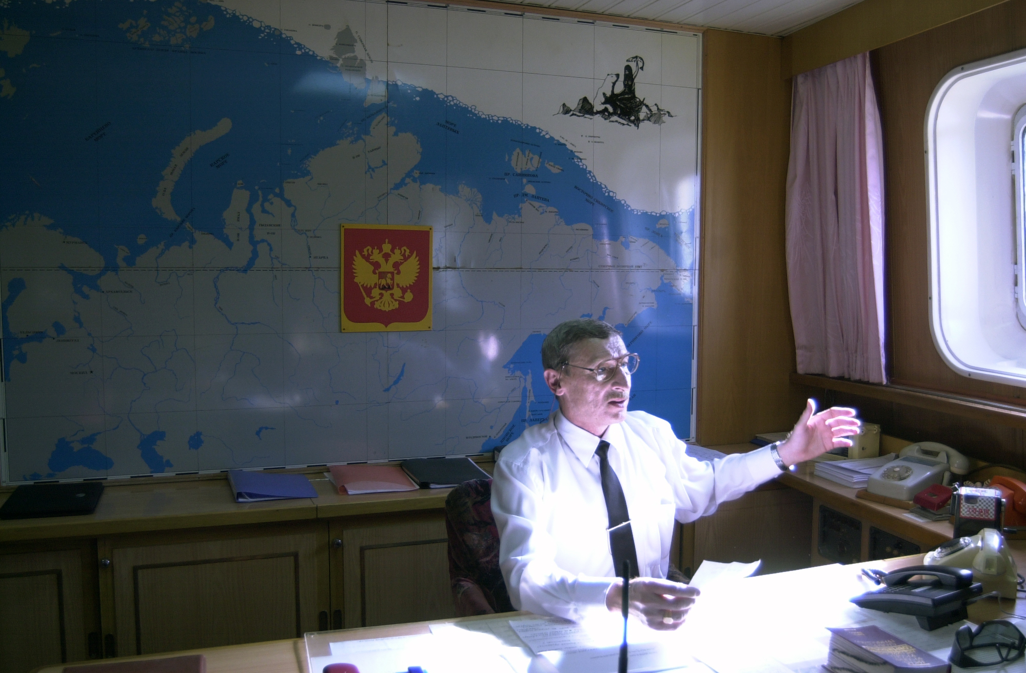 The captain of the Russian icebreaker KRASIN discusses the logistics of the ship's port call at McMurdo Station, Ross Island.