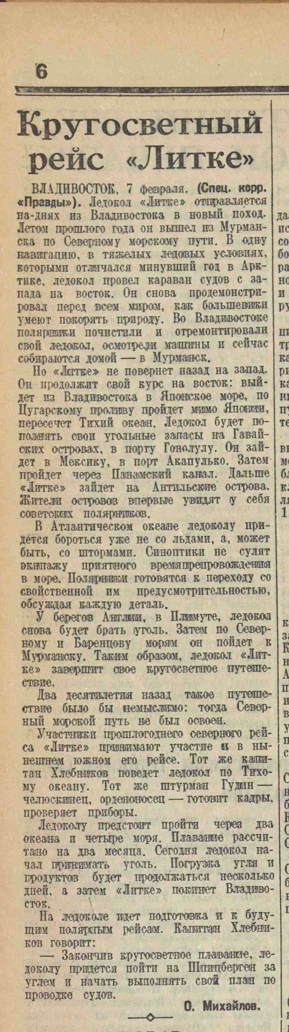Кругосветный рейс "Литке"//Правда,1937, № 38 (7004), 8 февраля