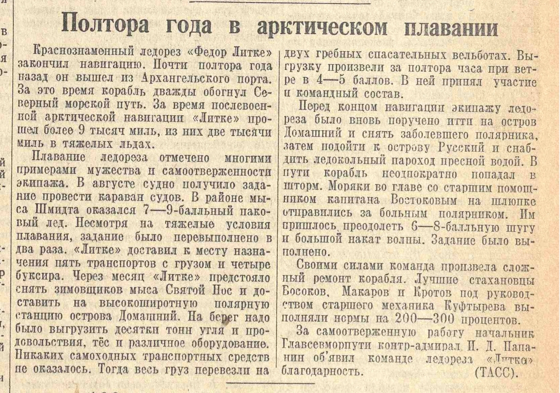 21-го октября во Владивостокский порт вернулся из арктического рейса краснознаменный ледокол "Литке". На борту ледокола прибыли работники научных экспедиций, ездивших на север, а также группа артистов, обслуживавших полярный рейс и зимовщики некоторых северных пунктов. Среди них начальник острова Врангеля — орденоносец т. Петров. В порту многочисленные делегации трудящихся встречали ледокол, блестяще закончивший боевое плавание во льдах Арктике. (ДАЛЬТАСС).