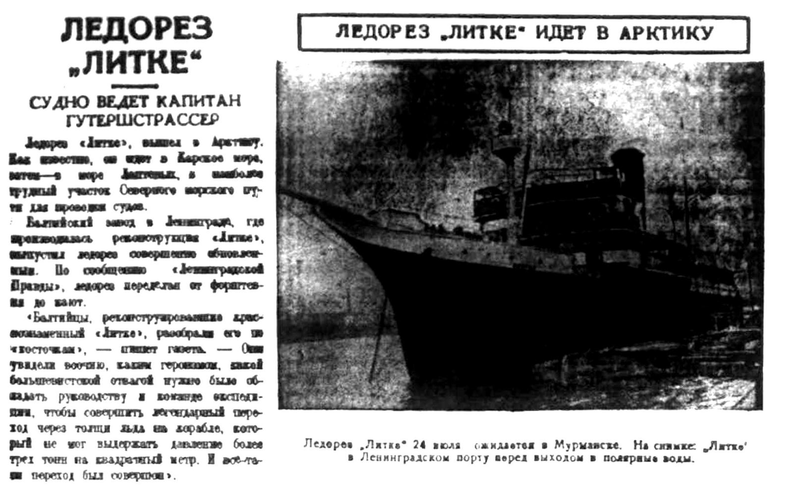 Балтийский завод в Ленинграде, где производилась реконструкция "Литке", выпустил ледорез совершенно обновленным. По сообщению "Ленинградской Правды", ледорез переделан от форштевня до кают.